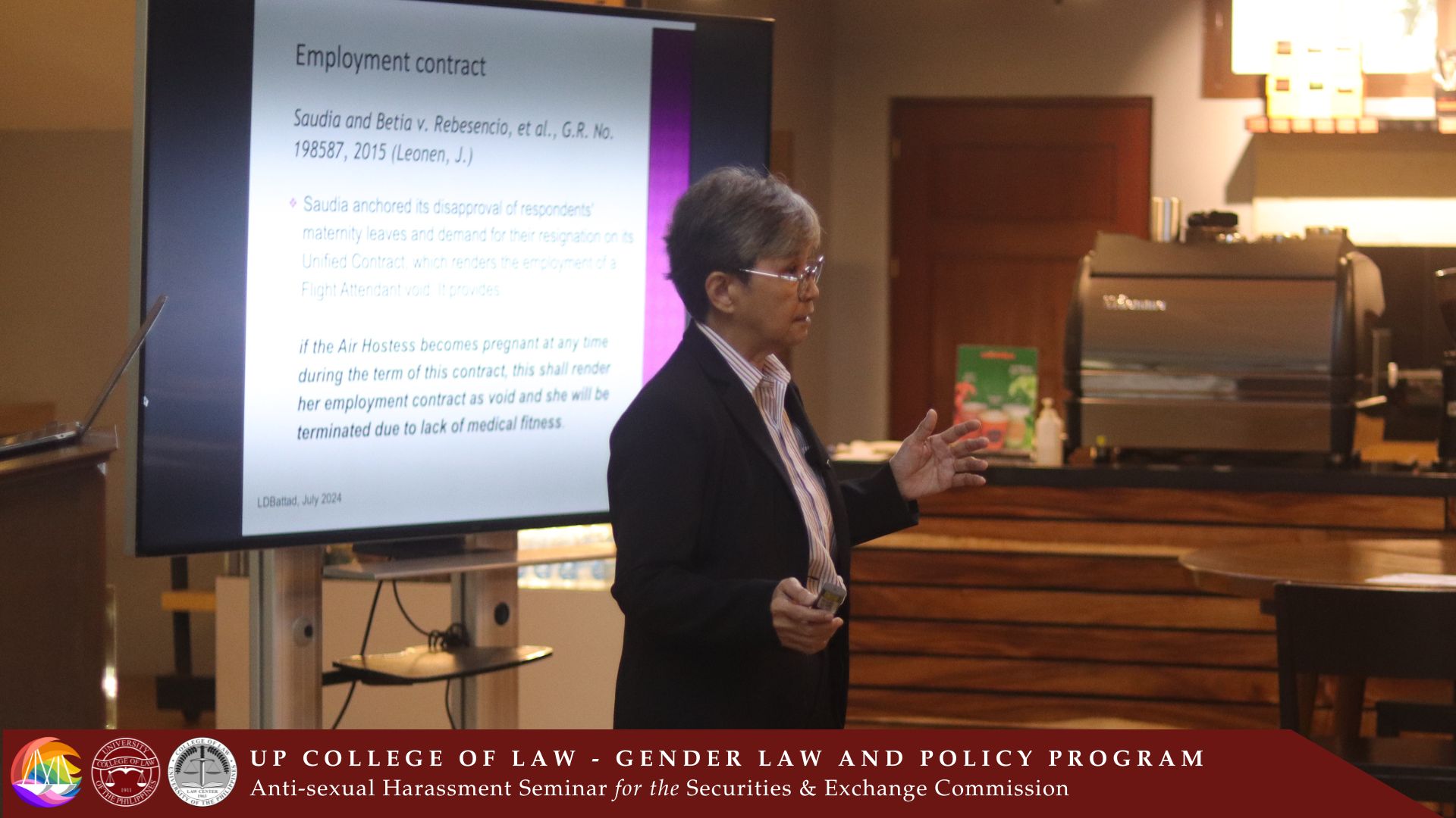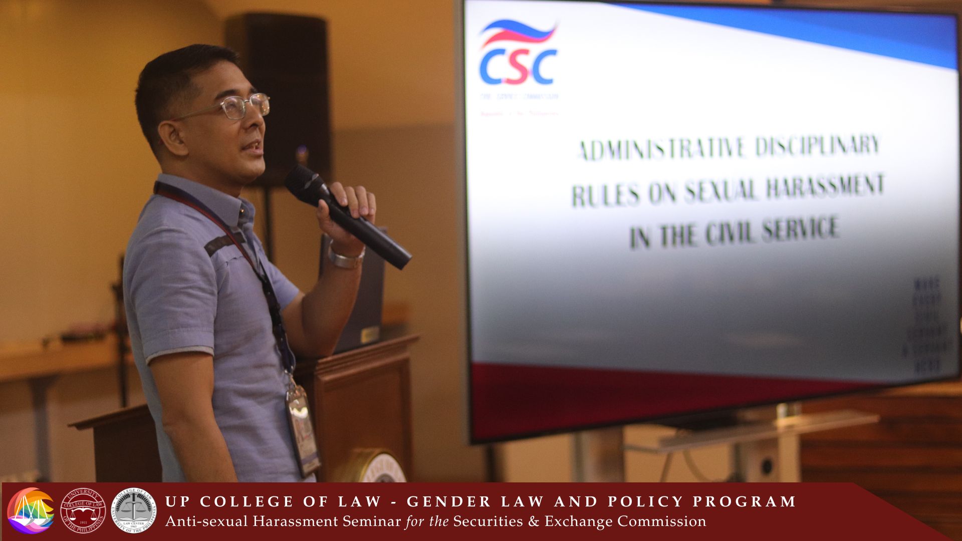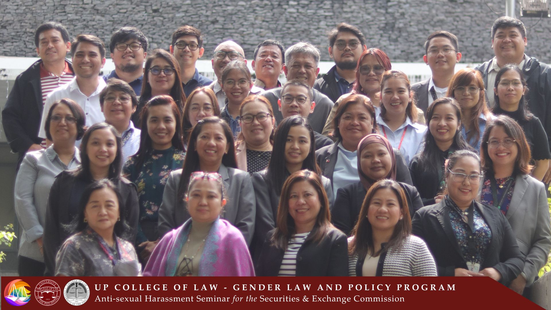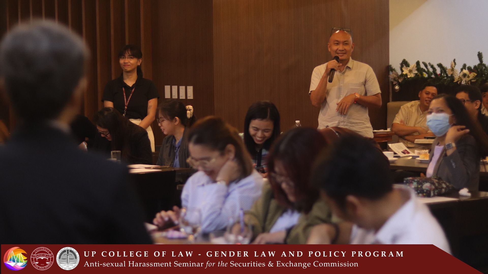 The UP College of Law (UP Law) – Gender Law and Policy Program (GLPP) held an Anti-Sexual Harassment Seminar for the Securities and Exchange Commission (SEC) from December 2 to 3, 2024. The two-day seminar was held at the Commons Law, UP Malcolm Hall. The seminar was dedicated to and attended by the members of the SEC’s Committee on Decorum and Investigation (CODI) on sexual harassment and their extension offices. The event was organized by the GLPP in partnership with the SEC as part of the latter’s promotional and educational activities on Anti-Violence Against Women.