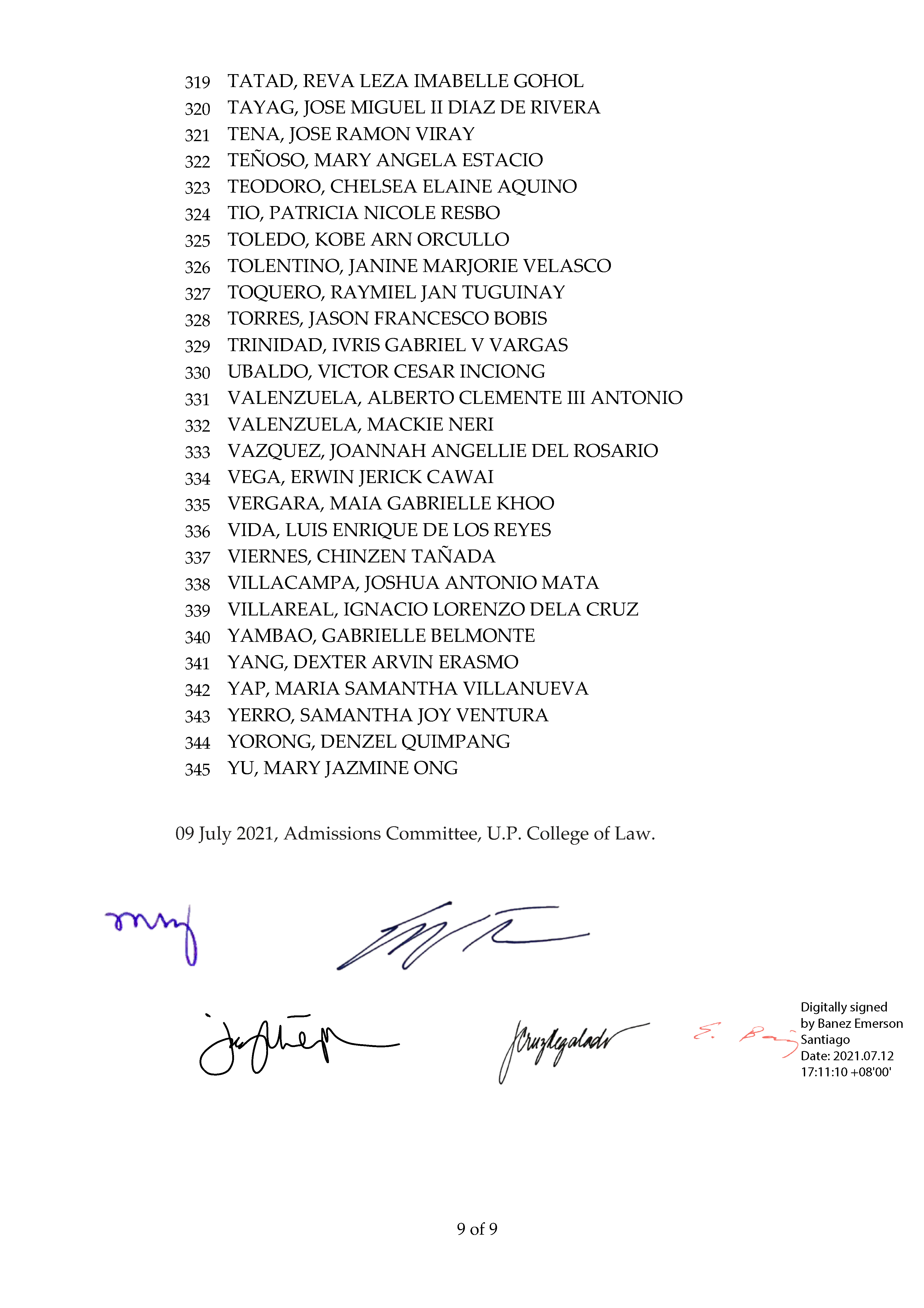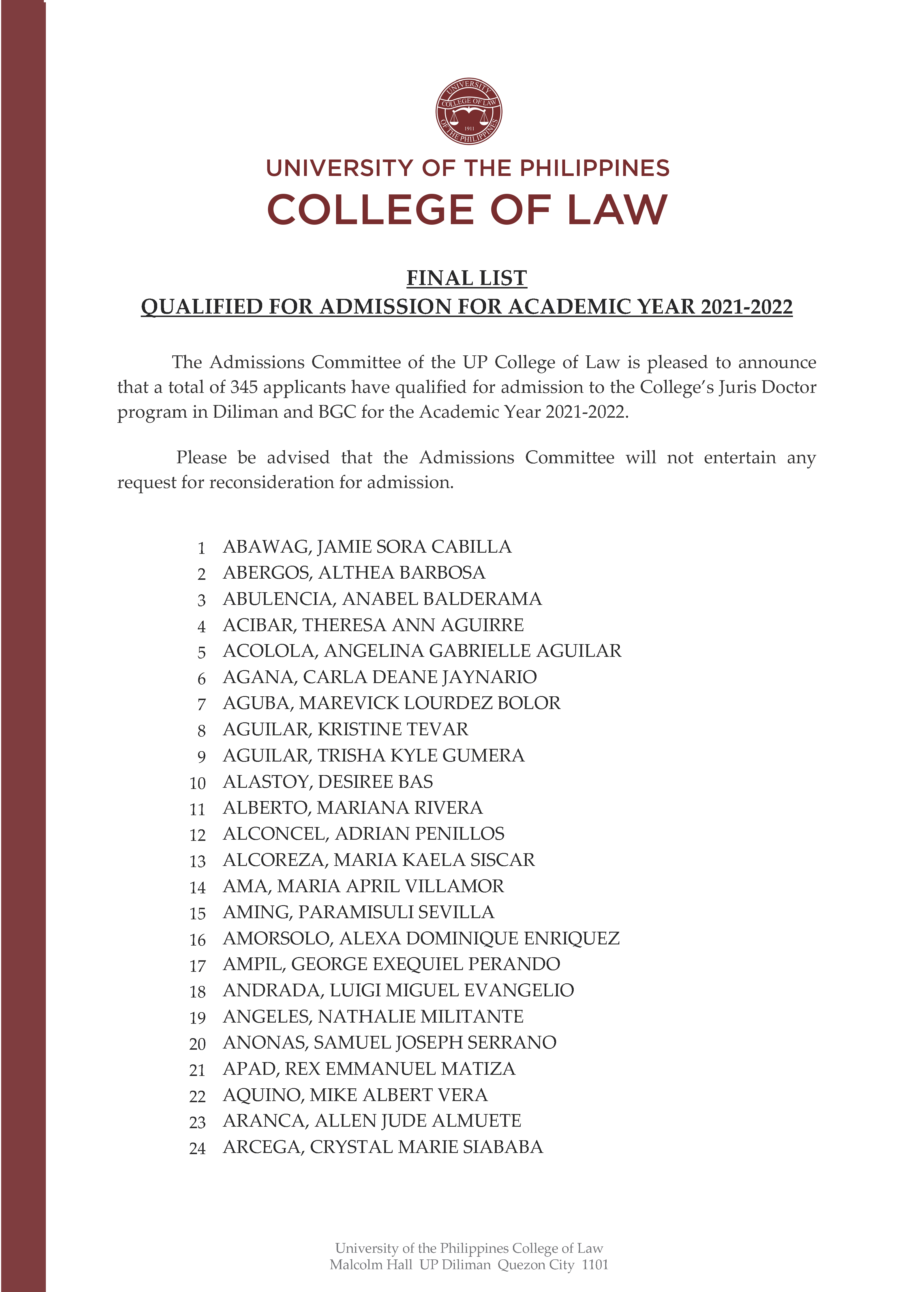 The Admissions Committee of the UP College of Law is pleased to announce that a total of 345 applicants have qualified for admission to the College’s Juris Doctor program in Diliman and BGC for the Academic Year 2021-2022.