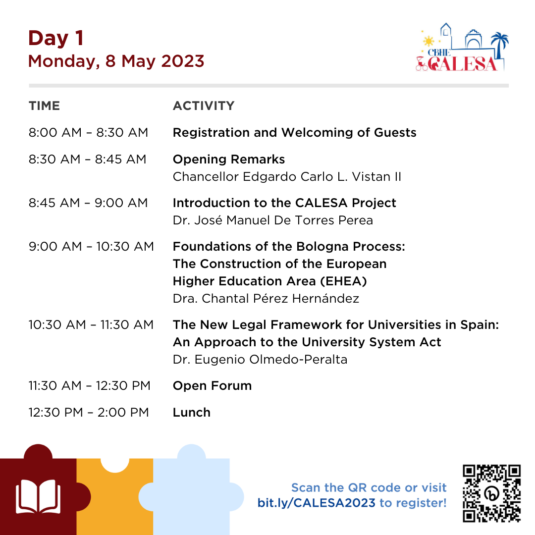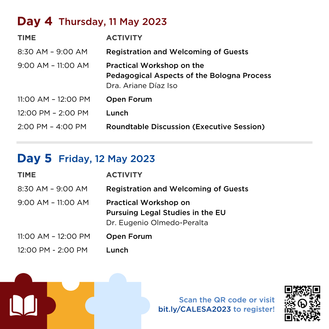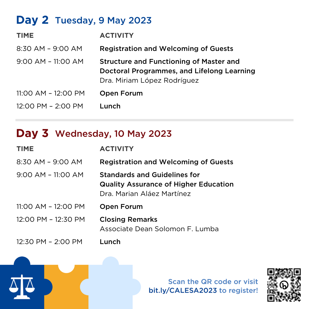 One more day until the CALESA International Conference on the Application of the Principles of the Bologna Process to University Academic Programmes hosted by the UP College of Law in partnership with the Legal Education Board!