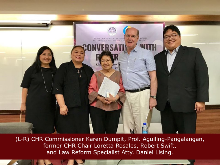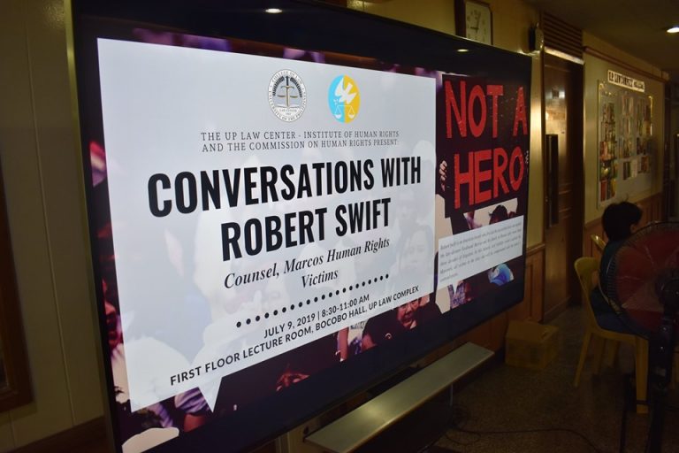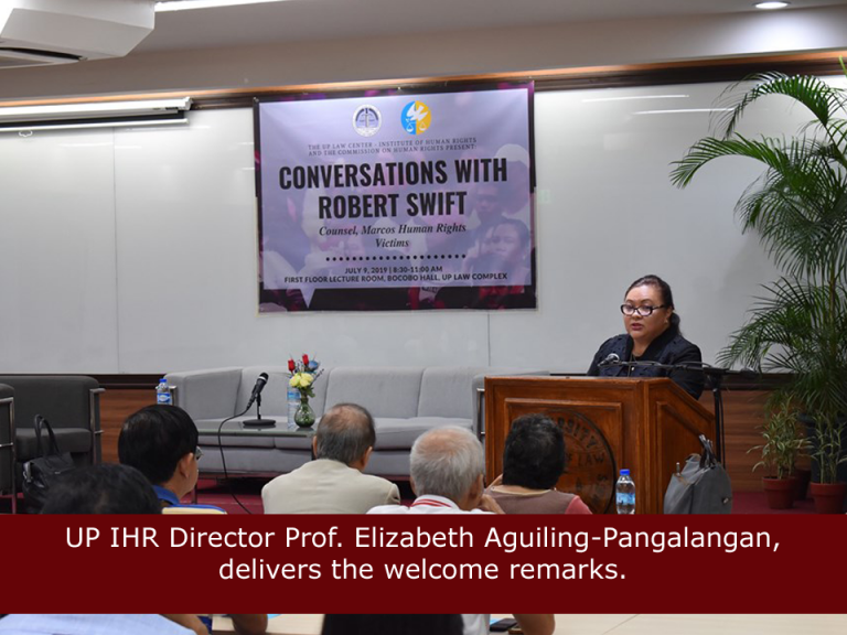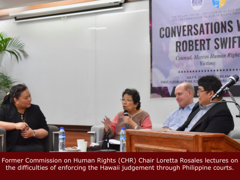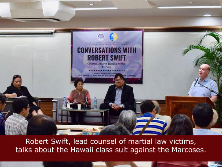 UP IHR hosts talk with martial law victims lead counsel The University of the Philippines Law Center – Institute of Human Rights (UP IHR) and the Commmission in Human Rights(CHR) hosted on 9 July 2019 a public talk for the lead counsel of a successful class suit of Martial Law victims against the Marcoses. Titled “Conversations with Robert Swift,” the event was held at the Lecture Room of Bocobo Hall. Swift is an American lawyer who first led around 6,000 martial law victims-survivors in winning the class suit against the estate of the late dictator Ferdinand Marcos. In the event, he detailed the long history and legal strategies of the civil litigation which started in 1986 and ended in triumph in 1995 at a Hawaii court. Also present to talk about the difficulties in enforcing the Hawaii judgement through Philippine courts was former CHR Chair Loretta Ann P. Rosales. UP IHR Director Elizabeth Aguiling-Pangalangan delivered the welcome remarks while CHR Commissioner Karen Dumpit closed the forum. Law Reform Specialist Atty. Daniel D. Lising moderated the event which ensured a robust exchange with the audience comprising mainly of victims and their families.