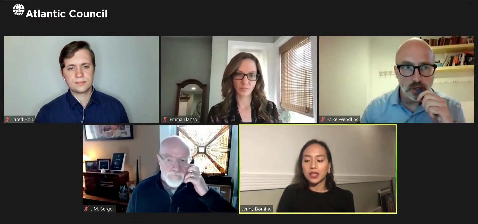 Other panelists in the event included J.M. Berger, Author and Ph.D. Candidate at Swansea University, Jared Holt, Resident Fellow of the DFRLab, and Emma Llansó, Director of the Free Expression Project at the Center for Democracy. The panelists agreed that de-platforming by social media sites has been for subjective reasons and have had an inconsistent application. They also discussed that while the move by governments to enact legislation to restrain social media companies is welcome, there is a risk in empowering governments to restrict free speech. Another problem is that data that could be used for research into better means of content moderation is not accessible; nevertheless, access to such data brings a host of legitimate privacy concerns.