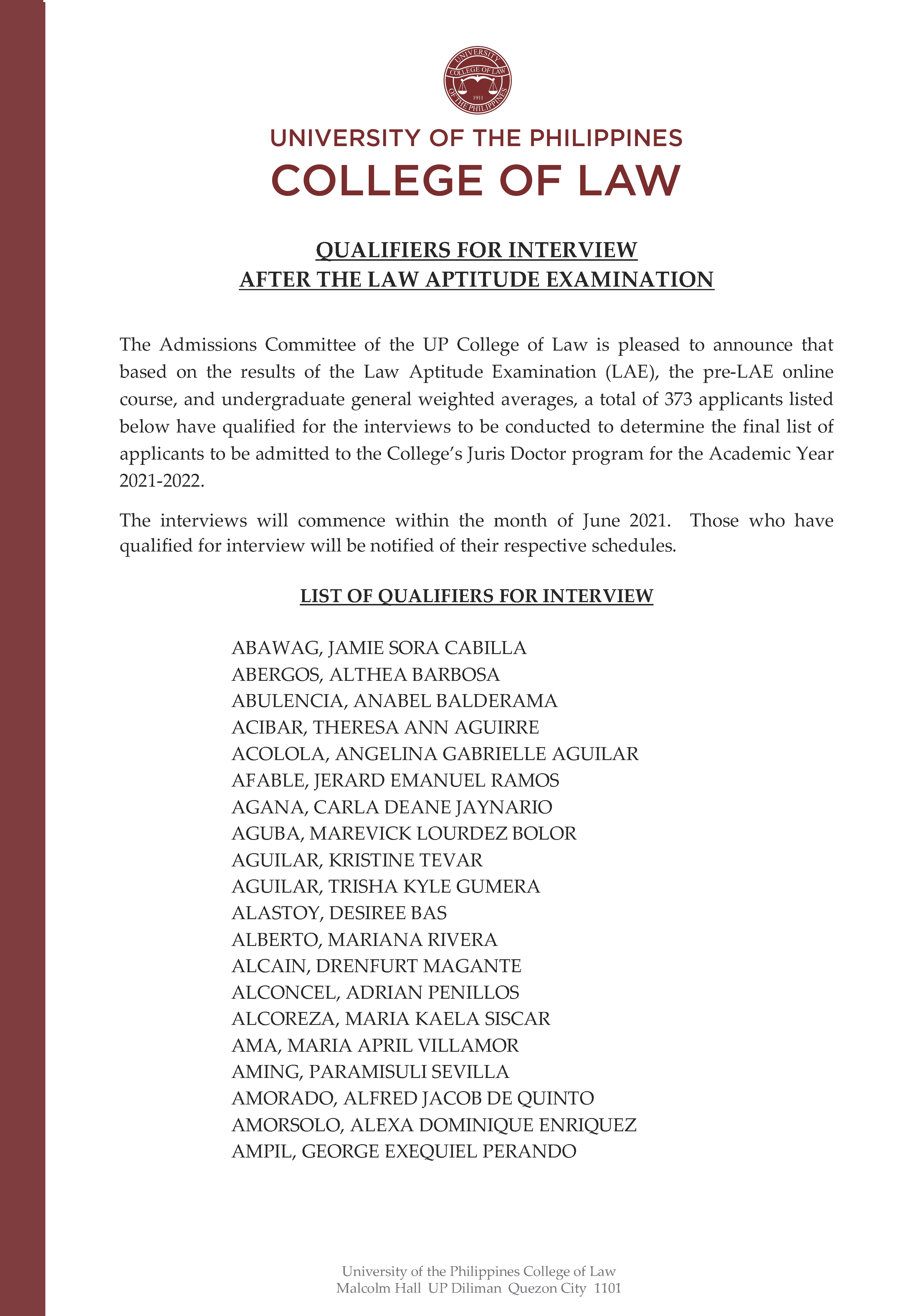 Based on the results of the Law Aptitude Examination (LAE), the pre-LAE online course, and undergraduate general weighted averages, the Admissions Committee of the UP College of Law is pleased to announce that the 373 applicants listed below have qualified for the interviews to determine the final list of applicants for admission to the College’s Juris Doctor program for the Academic Year 2021-2022.