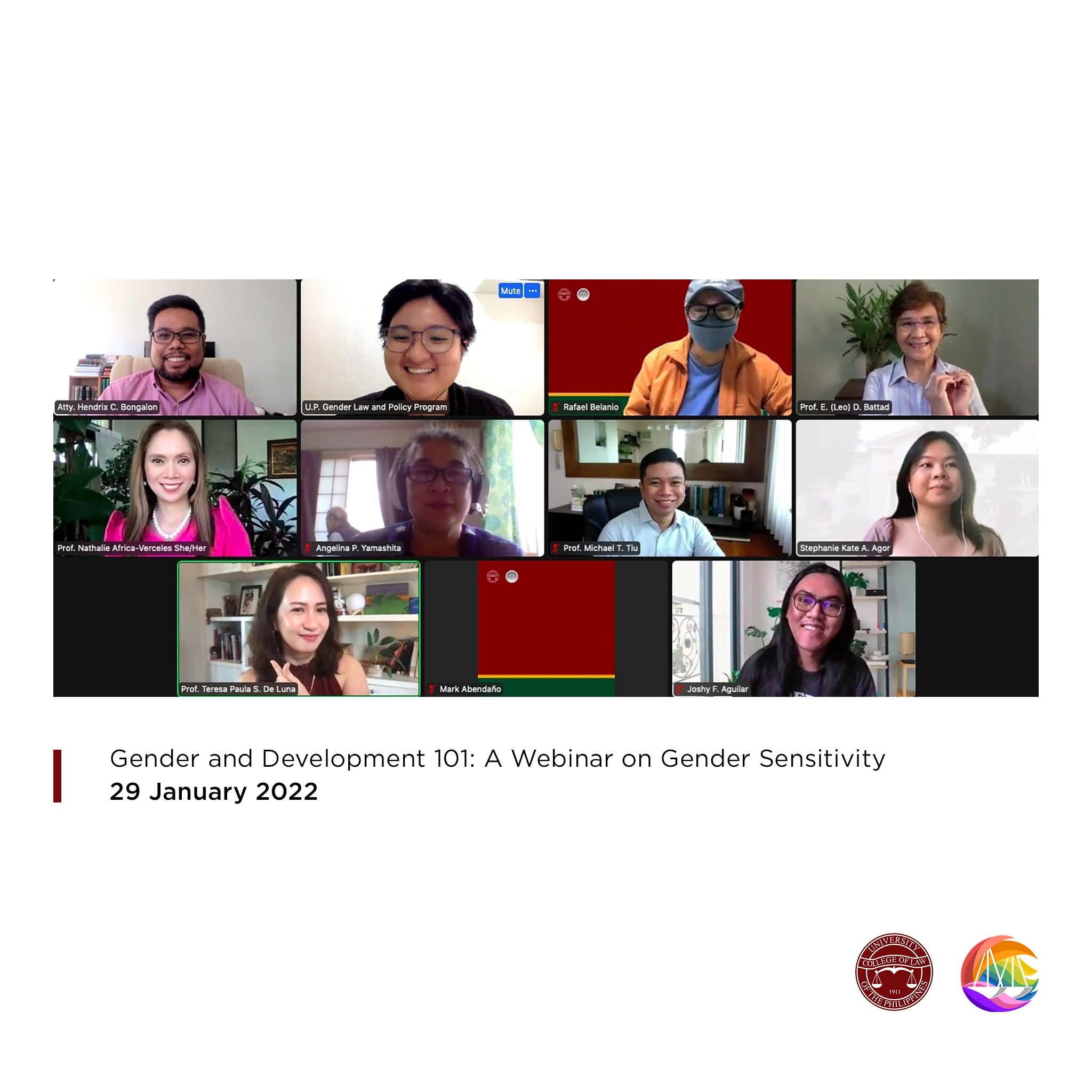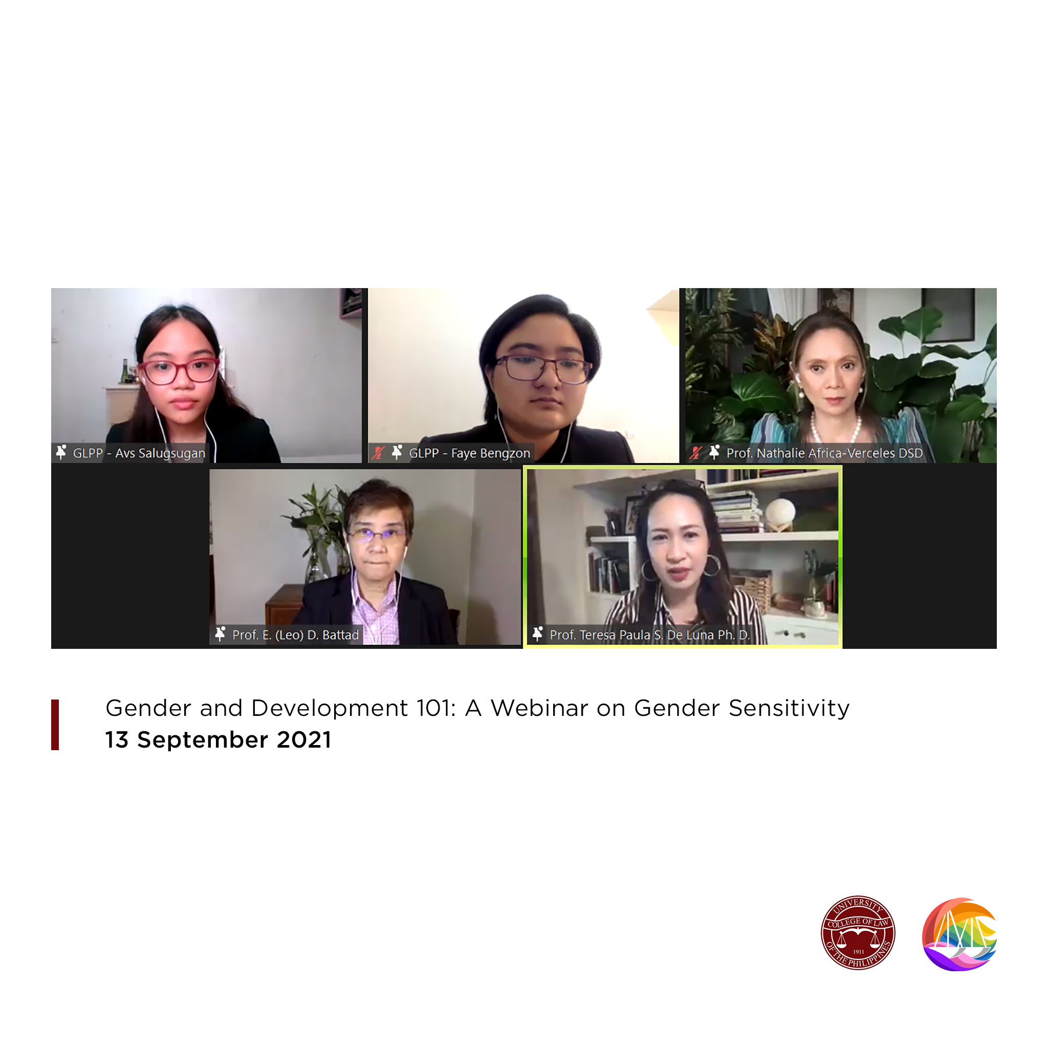On 13 September 2021 and 9 January 2022, with the assistance of the UP Law Information and Publication Division (IPD) and in partnership with various student organizations, the UP GLPP conducted the first gender sensitivity webinar primarily geared toward incoming first-year students of the UP College of Law. A total of 336 participants, composed largely of first-year students from the UP Diliman, UP BGC, and the recently opened UP Iloilo campuses, attended the event via Zoom.