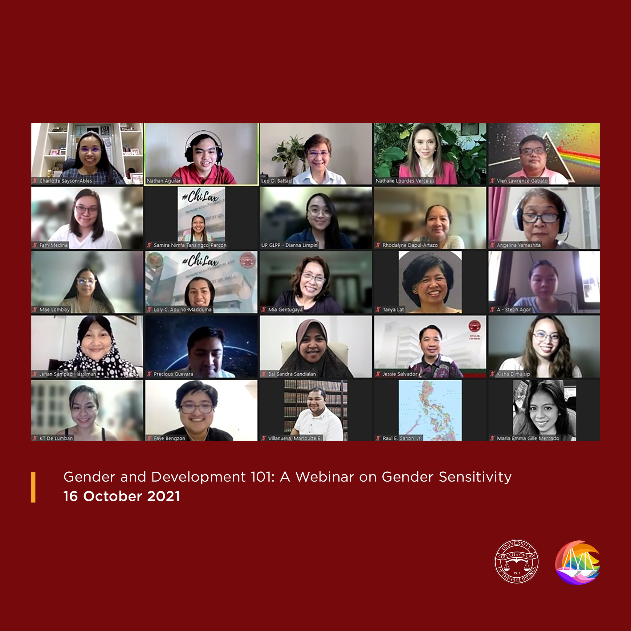Upon the request of the Graduate Program Coordinator under the Office of the College Secretary, the UP GLPP also conducted a gender sensitivity webinar exclusively for the College’s LL.M. students on 16 October 2021. The event was attended by 14 LL.M. students.