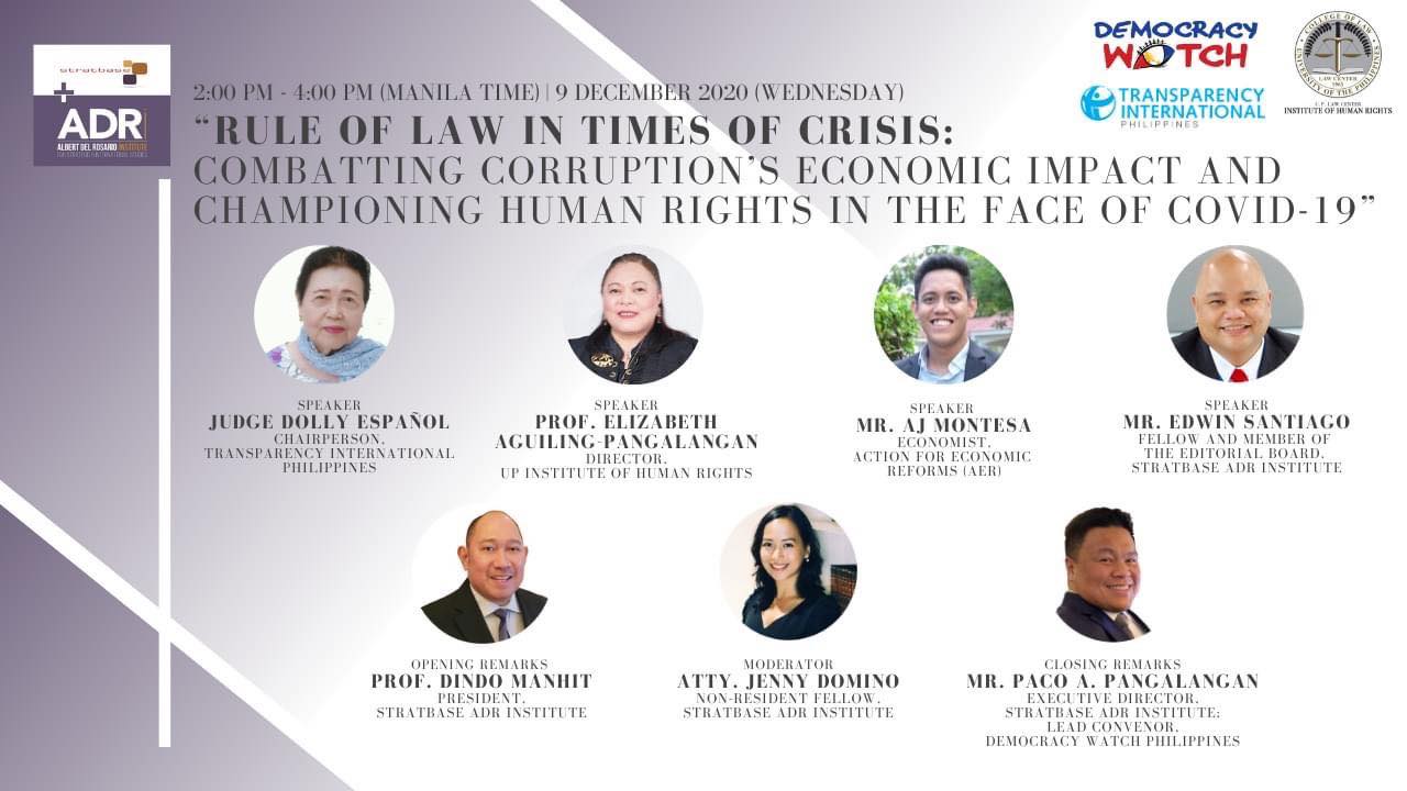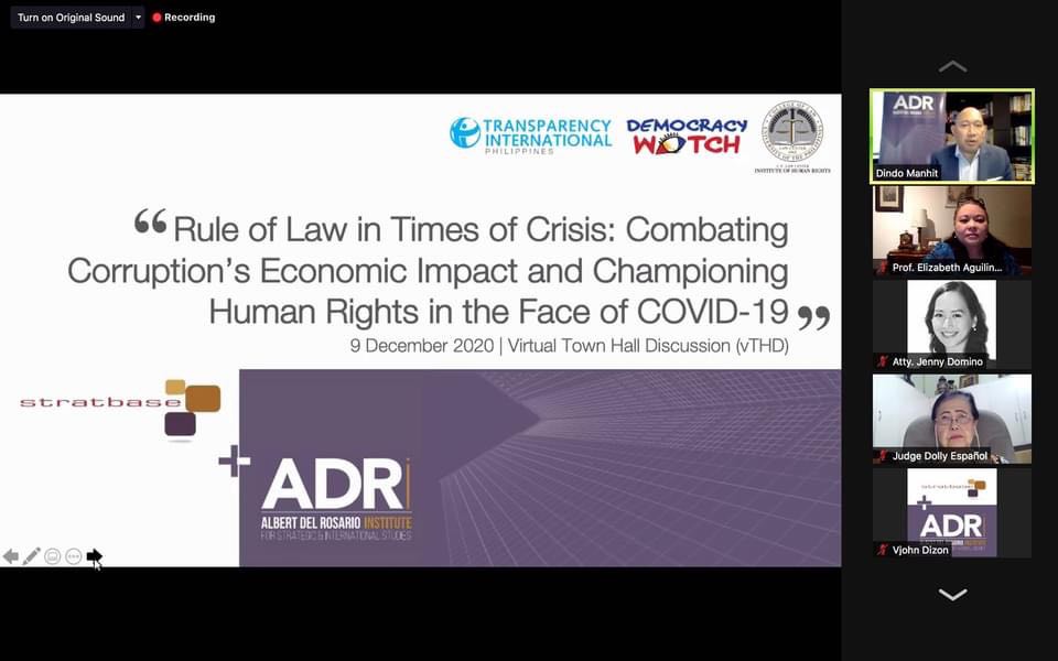 To commemorate International Anti-Corruption Day on December 9 and International Human Rights Day on 10 December, the UP Institute of Human Rights (UP IHR) co-hosted with Stratbase ADR Institute (ADRi) and Transparency International Philippines a virtual town hall discussion entitled “Rule of Law in Times of Crisis: Combatting Corruption and Championing Human Rights in the Face of COVID-19”. In partnership, the forum aimed at examining how corruption and human rights violations affect the rule of law, Philippine democracy, and economic development.
