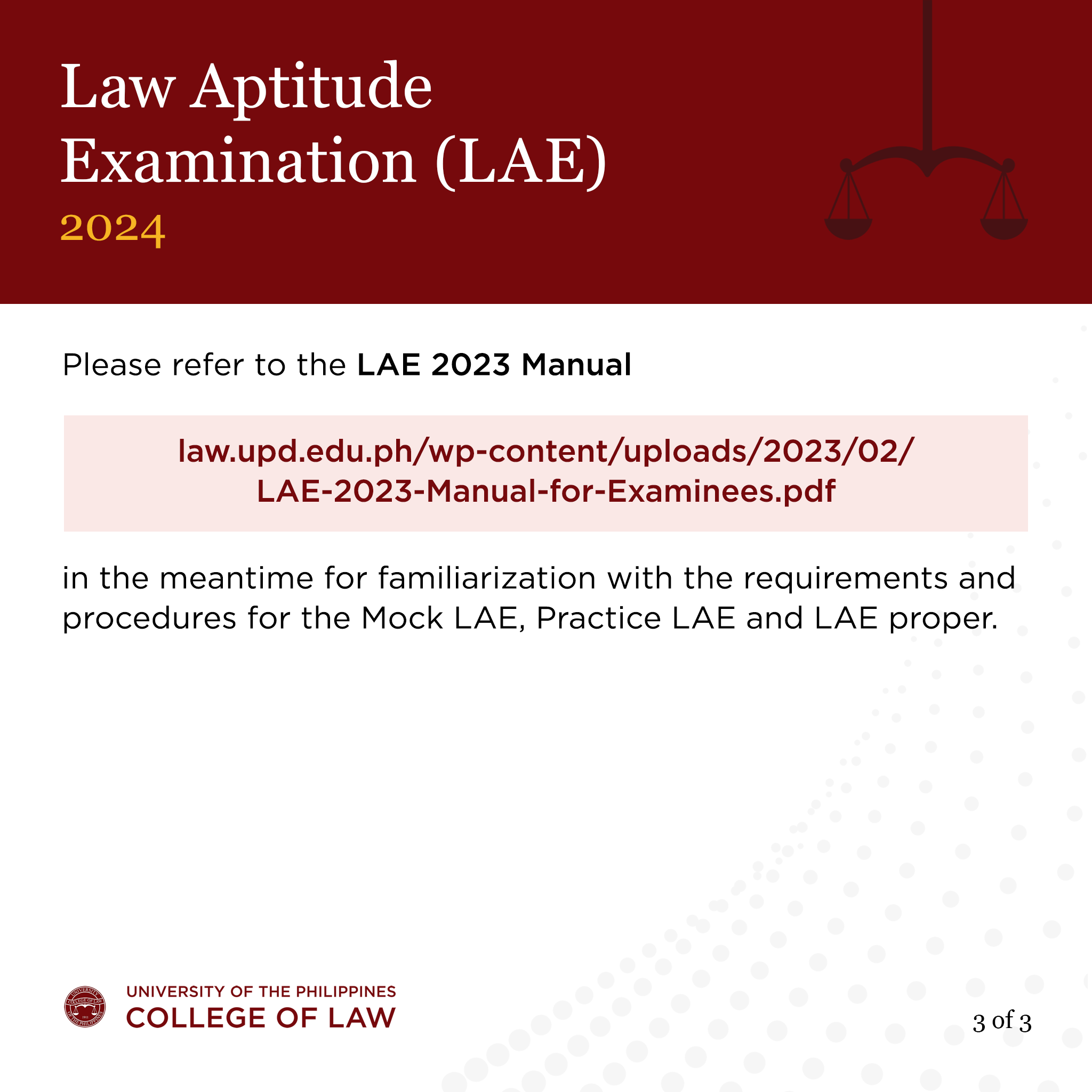 Please refer to the LAE 2023 Manual (https://uplaw.ph/lae2023manualforexaminees) in the meantime for familiarization with the requirements and procedures for the Mock LAE, Practice LAE and LAE proper.