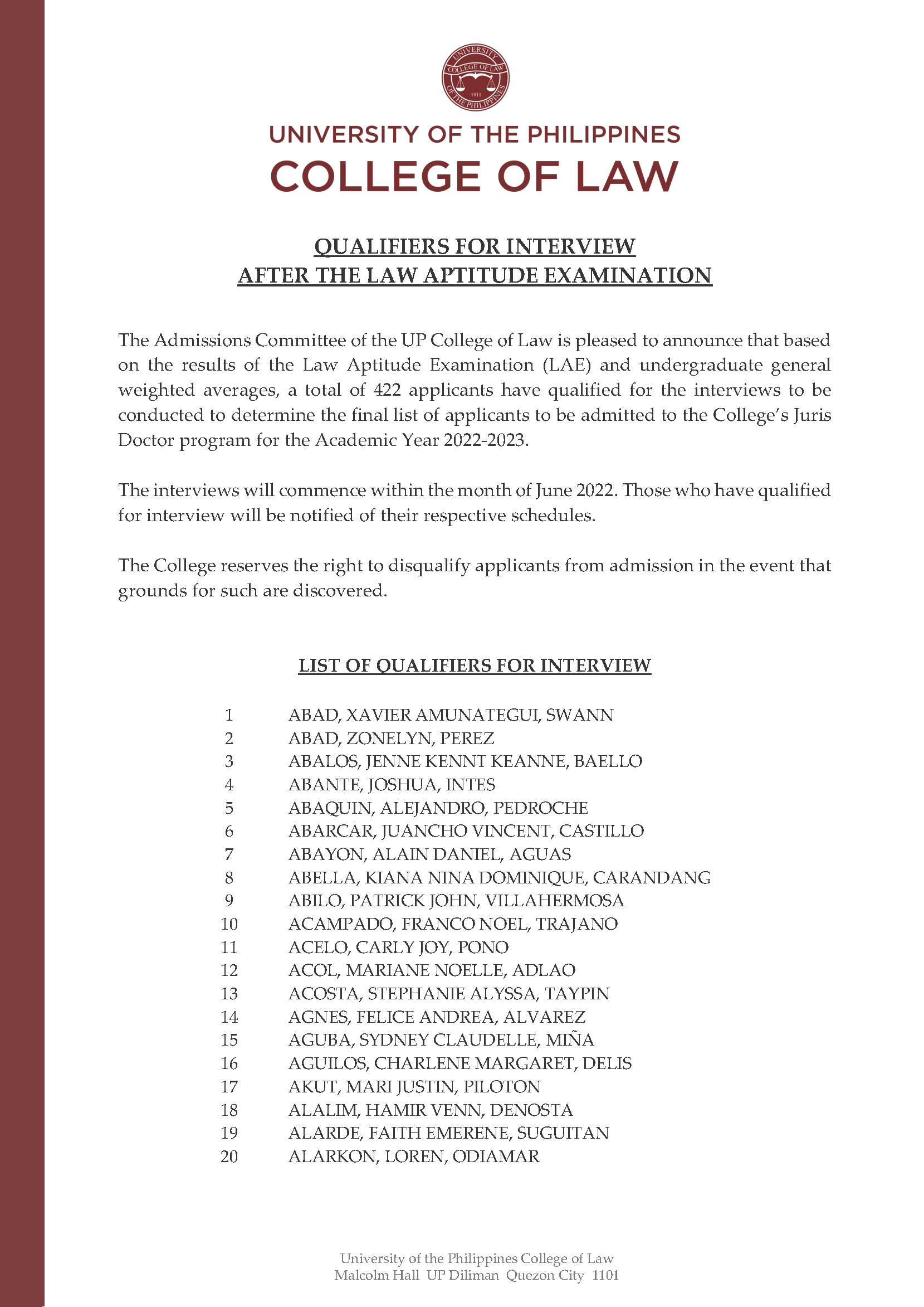 The Admissions Committee of the UP College of Law is pleased to announce that based on the results of the Law Aptitude Examination (LAE) and undergraduate general weighted averages, a total of 422 applicants have qualified for the interviews to be conducted to determine the final list of applicants to be admitted to the College’s Juris Doctor program for the Academic Year 2022-2023.