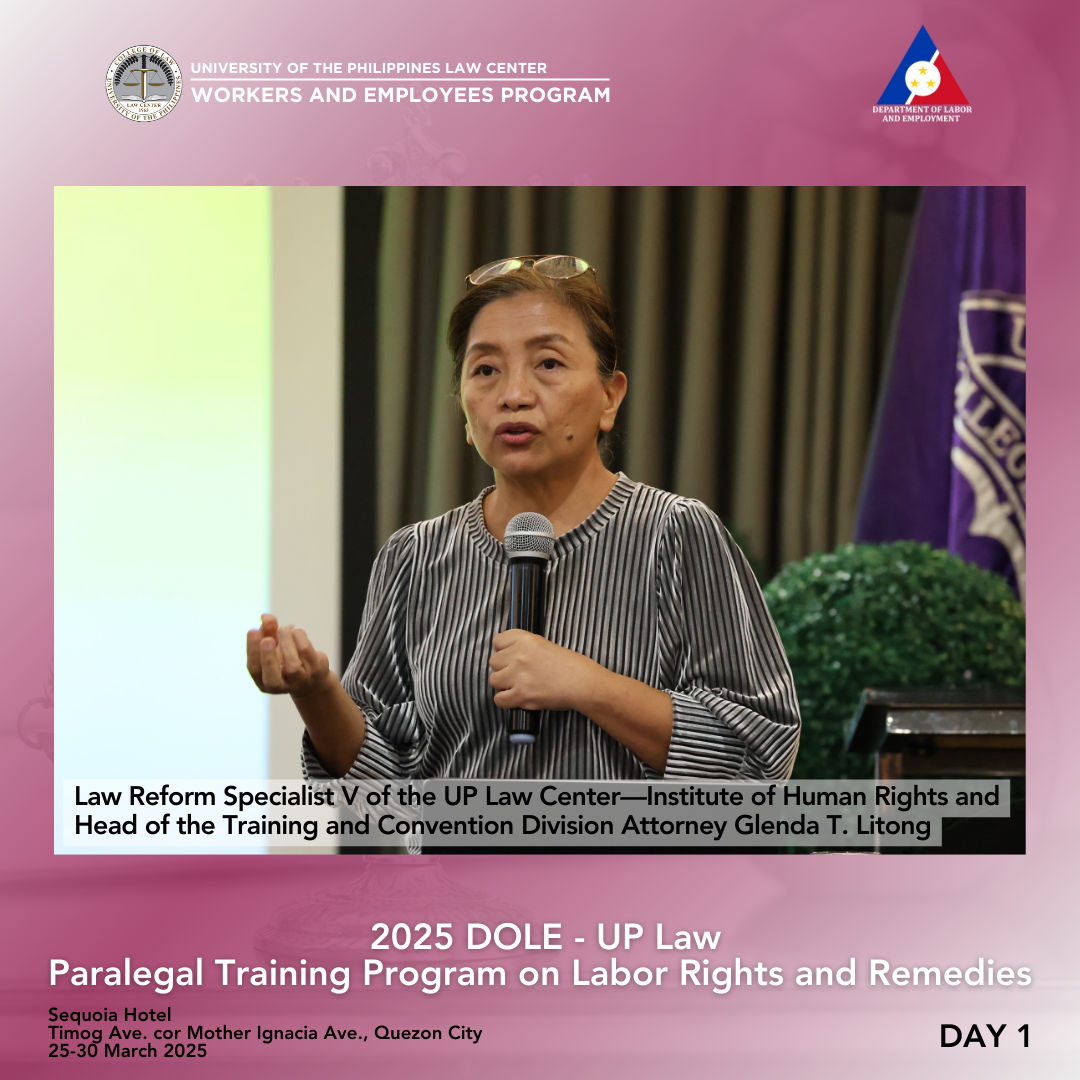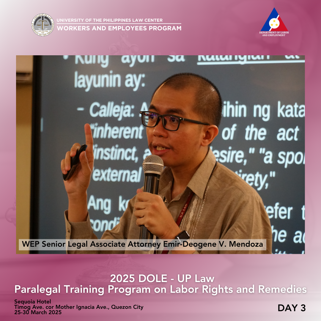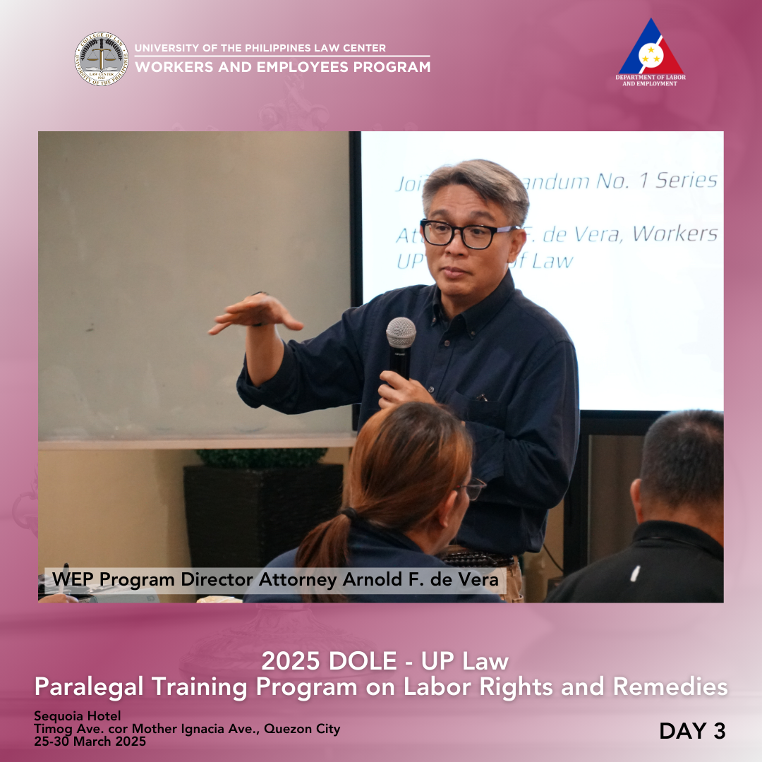 Attorney Arnold F. De Vera, WEP Program Director, discussed fundamental legal principles of labor law, especially social justice, equality, management prerogative, and its limitations. The duty of the State to respect, protect, and fulfill human rights was explained in light of various legal instruments, including the Constitution, statutes, and departmental issuances. Human rights also have their legal bases in customary international law, the Universal Declaration of Human Rights (UDHR) of 1948, the International Covenant on Civil and Political Rights (ICCPR), and the International Covenant on Economic, Social and Cultural Rights (ICESCR). This portion concluded with a discussion on the International Labour Organization.