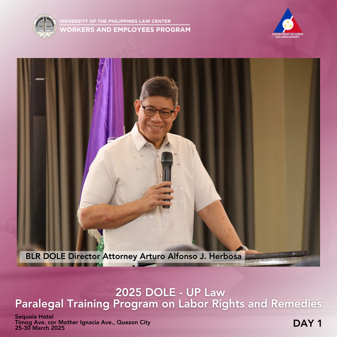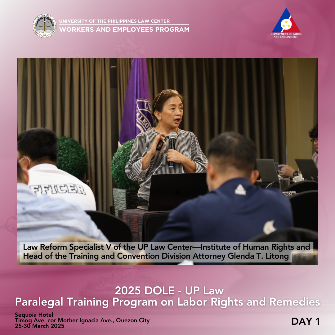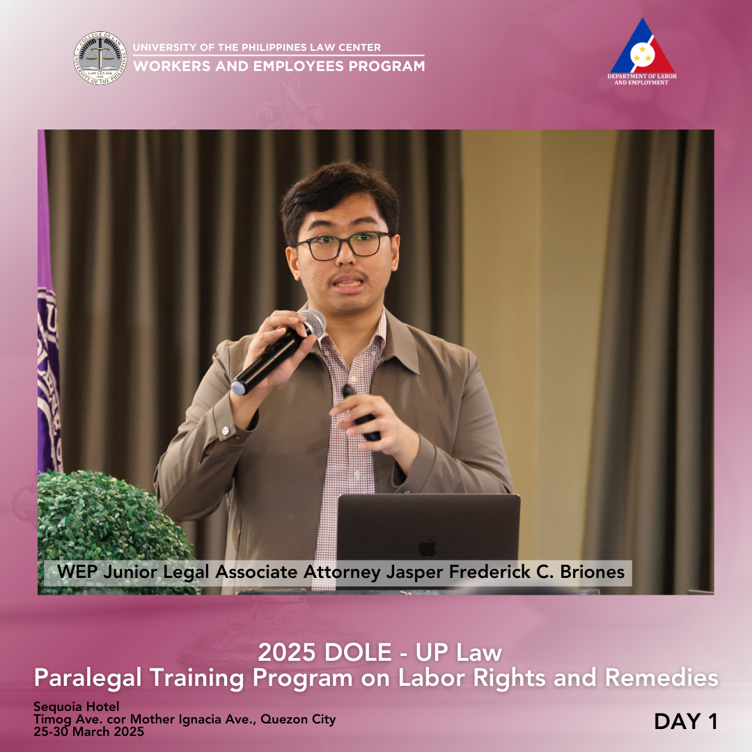 Attorney Arnold F. De Vera, WEP Program Director, discussed fundamental legal principles of labor law, especially social justice, equality, management prerogative, and its limitations. The duty of the State to respect, protect, and fulfill human rights was explained in light of various legal instruments, including the Constitution, statutes, and departmental issuances. Human rights also have their legal bases in customary international law, the Universal Declaration of Human Rights (UDHR) of 1948, the International Covenant on Civil and Political Rights (ICCPR), and the International Covenant on Economic, Social and Cultural Rights (ICESCR). This portion concluded with a discussion on the International Labour Organization.