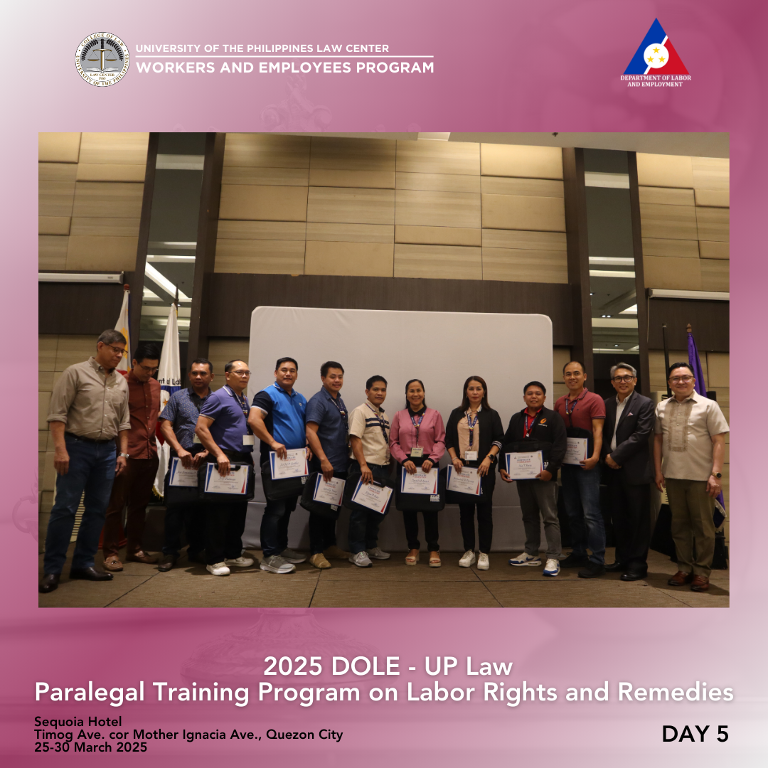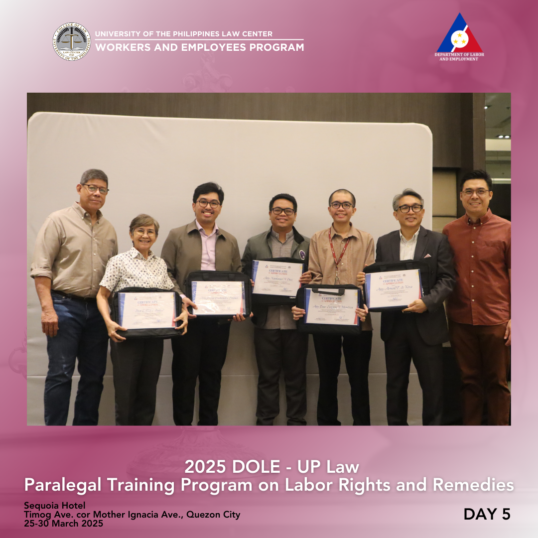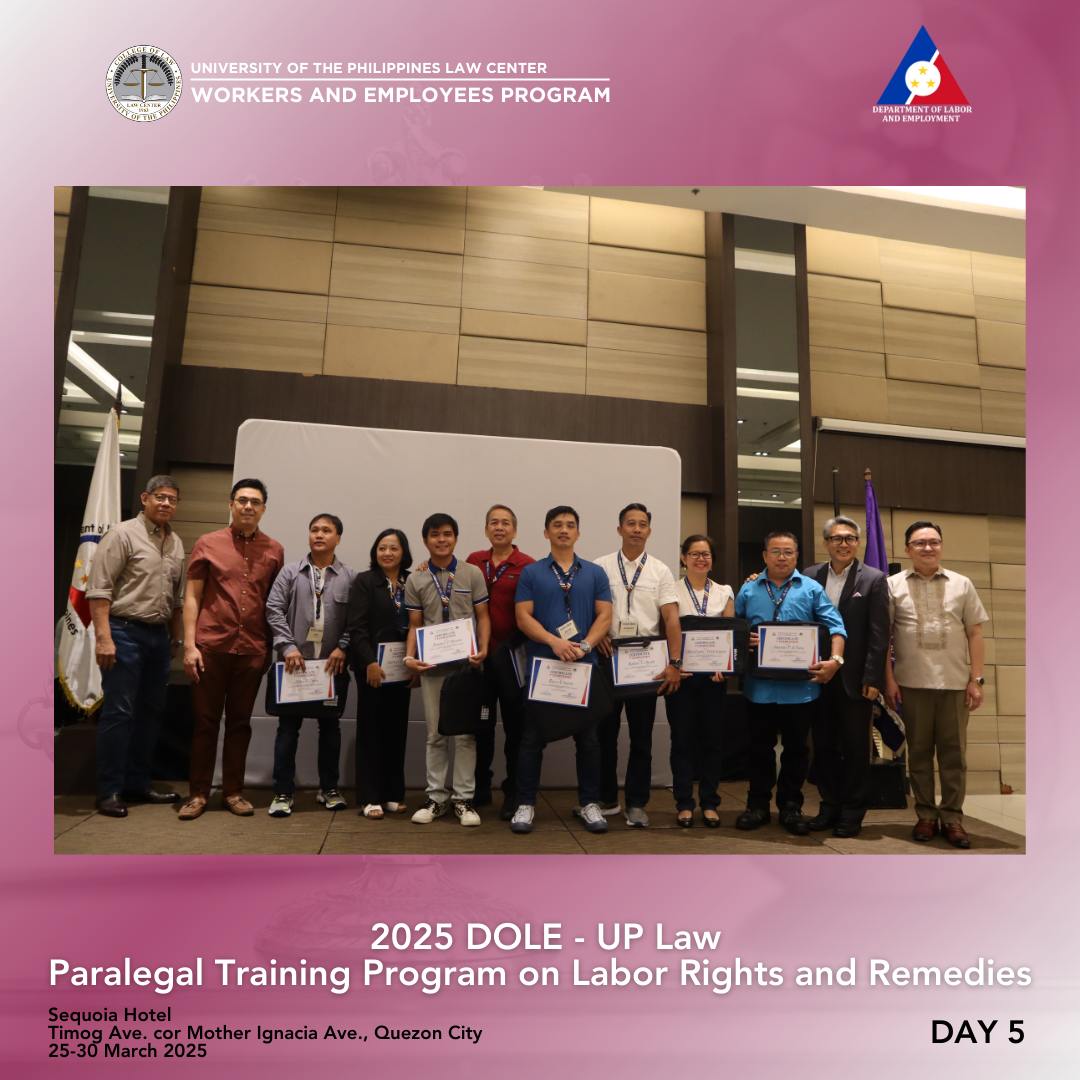 DOLE Assistant Secretary Attorney Lennard Constantine C. Serrano thanked the UP College of Law, UP Law Center, WEP, and the resource persons for the successful week-long training. He congratulated the 36 participants for completing the challenging six-day program, which covered criminal, civil, labor, and procedural law, as well as paralegal skills—topics typically studied over several years in law school. While there were no graded recitations, activities kept everyone engaged. The participants were then encouraged to continue serving as voices for workers, to consider a career in law, and to act as advocates for workers’ rights.