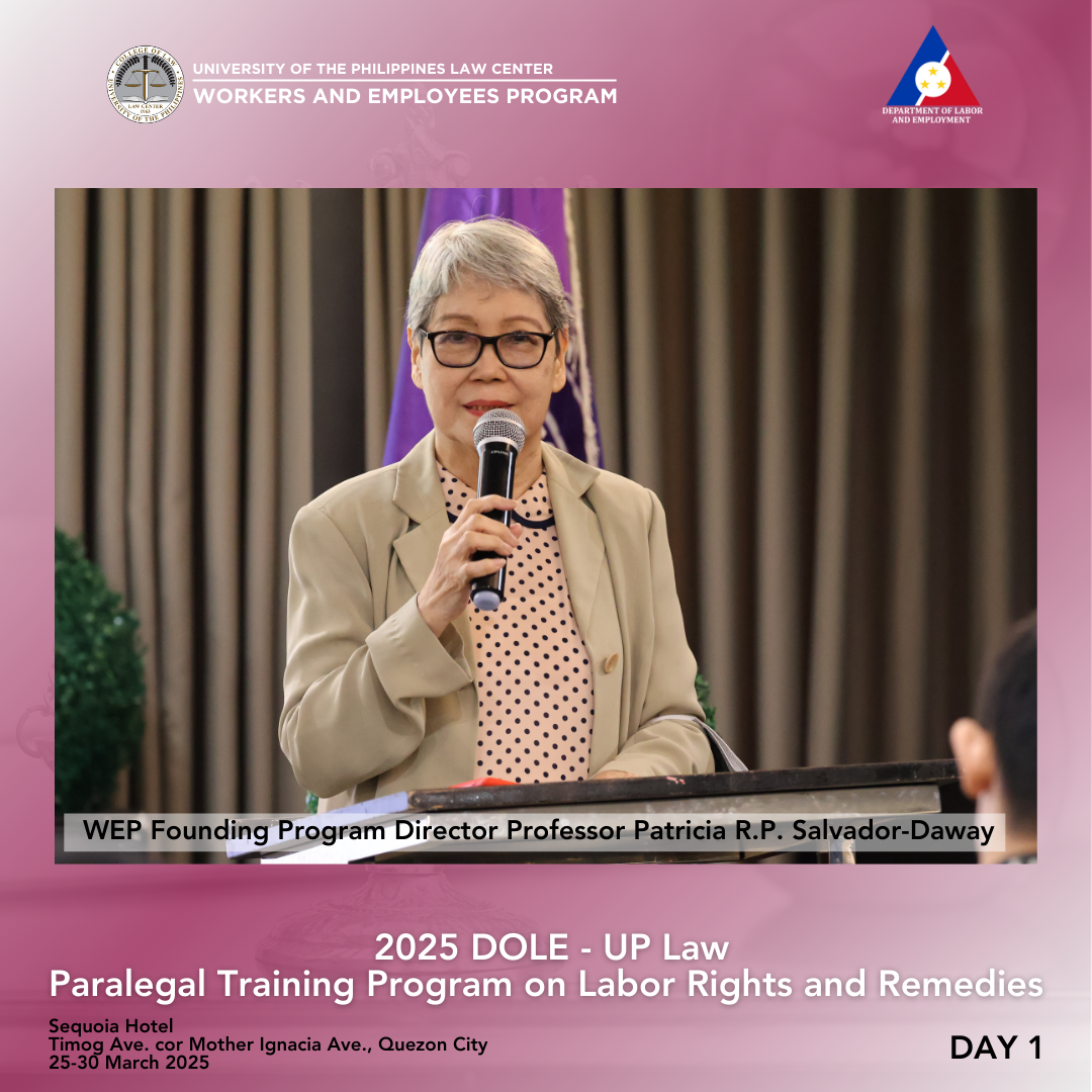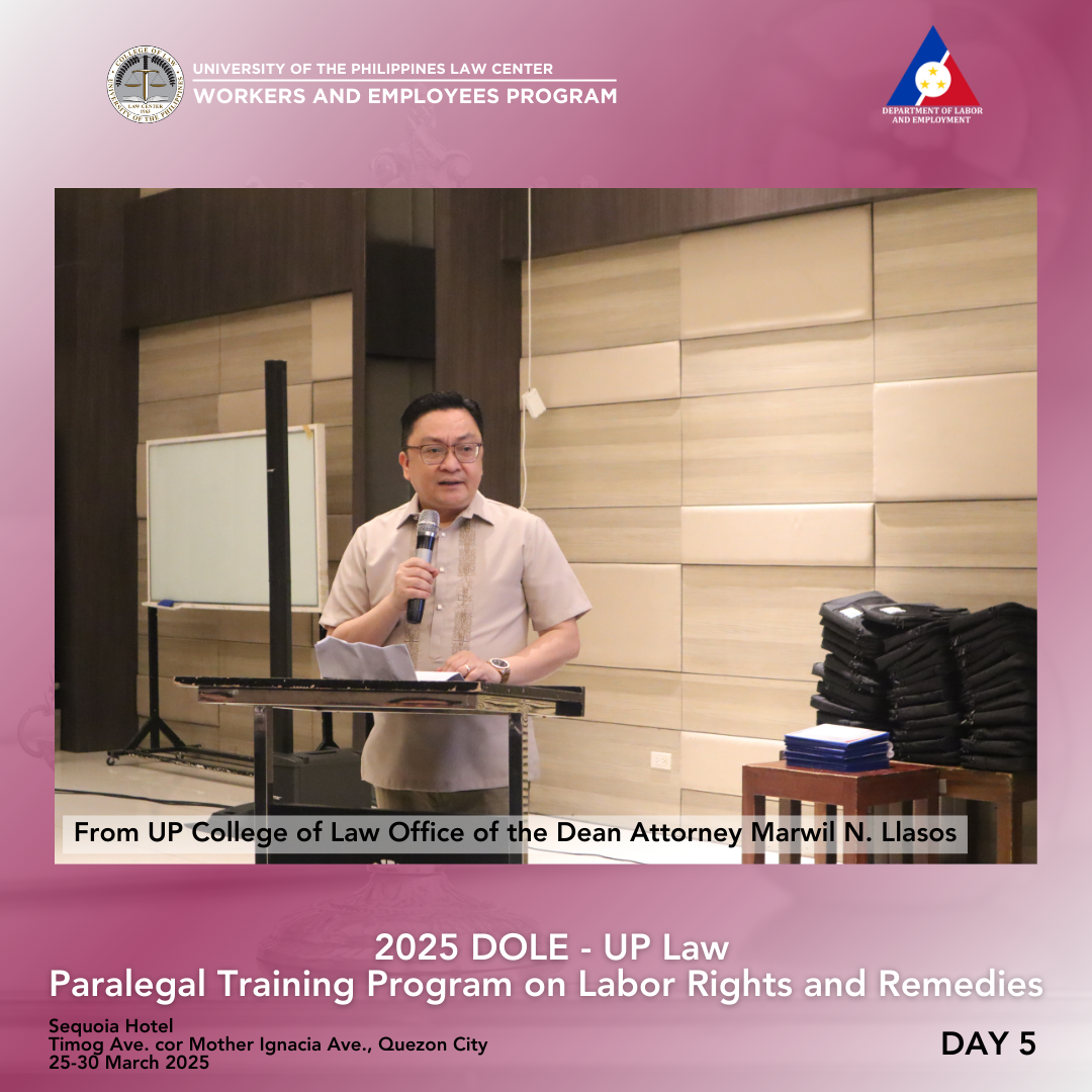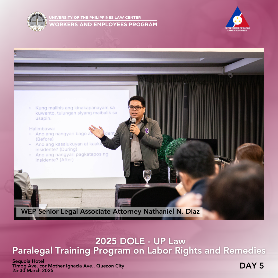 DOLE Assistant Secretary Attorney Lennard Constantine C. Serrano thanked the UP College of Law, UP Law Center, WEP, and the resource persons for the successful week-long training. He congratulated the 36 participants for completing the challenging six-day program, which covered criminal, civil, labor, and procedural law, as well as paralegal skills—topics typically studied over several years in law school. While there were no graded recitations, activities kept everyone engaged. The participants were then encouraged to continue serving as voices for workers, to consider a career in law, and to act as advocates for workers’ rights.