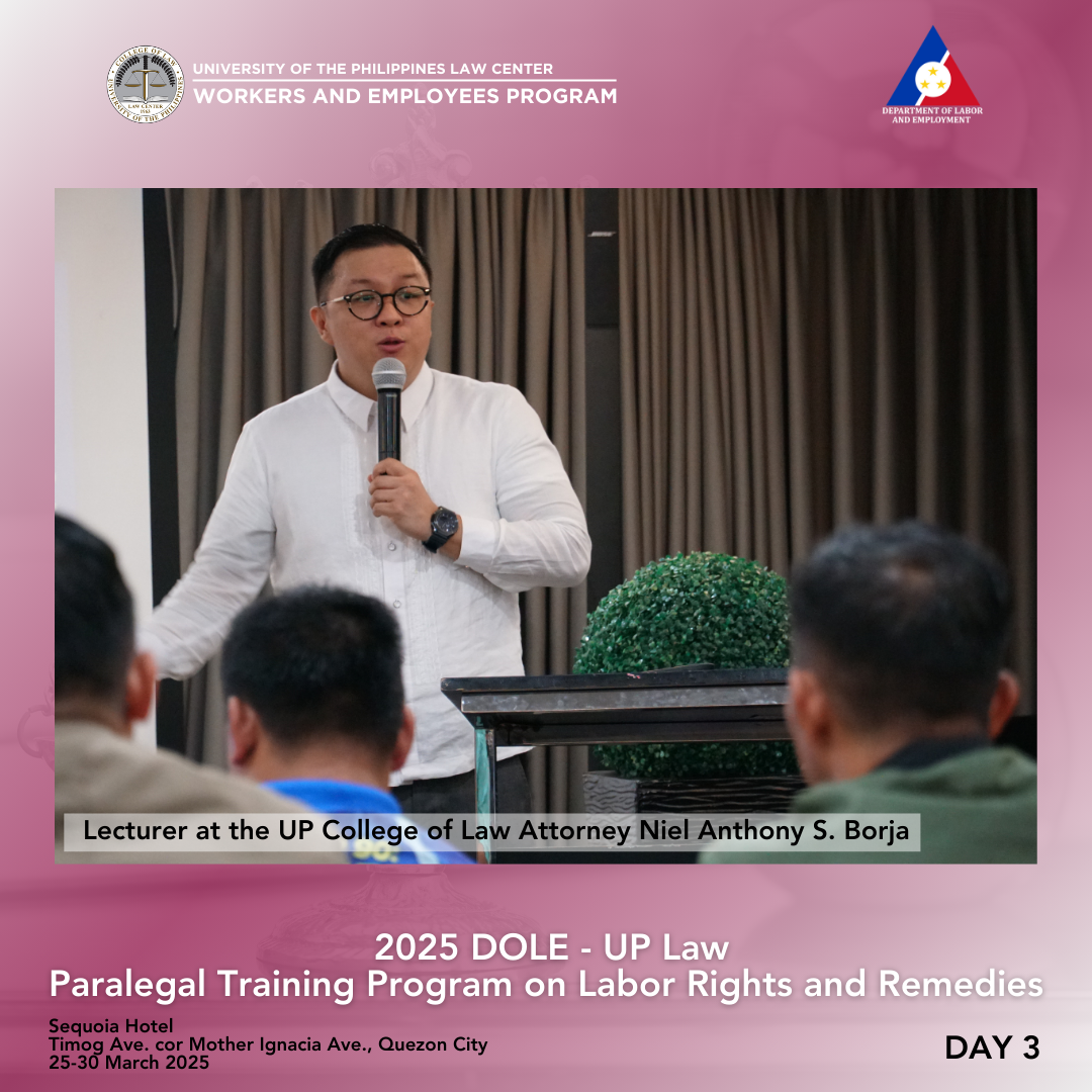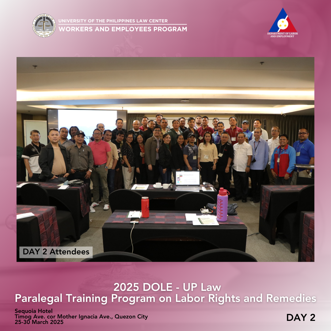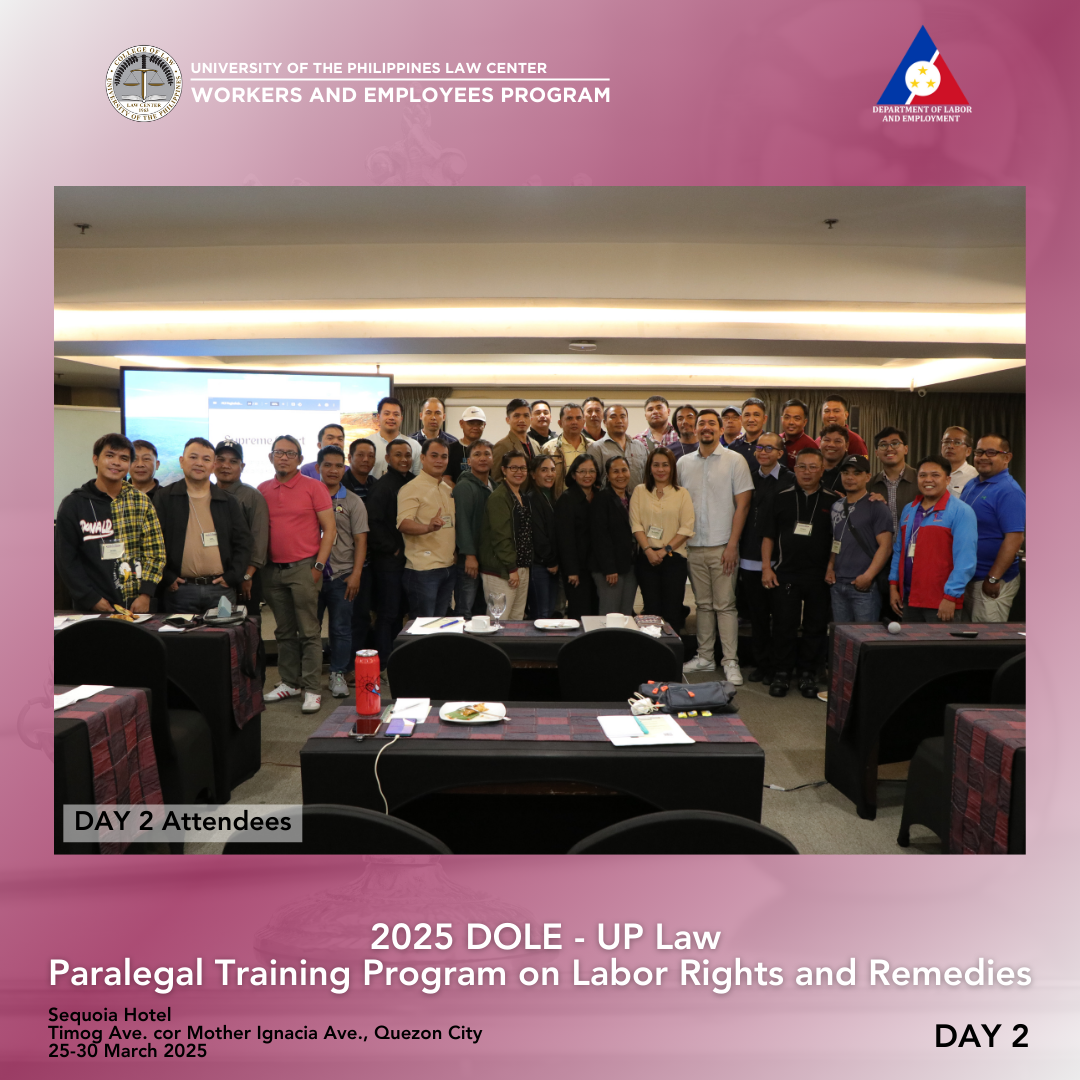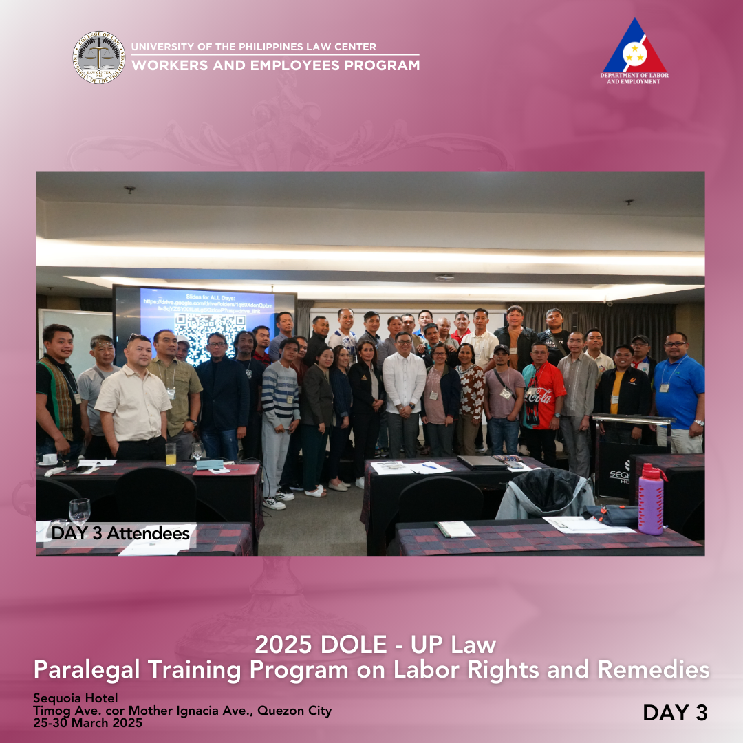 Thirty-six (36) participants from the Cordillera Administrative Region, Regions I, II, and III completed the 3rd round of the Department of Labor and Employment (DOLE)–University of the Philippines (UP) College of Law Paralegal Training Program on Labor Rights and Remedies held in Sequoia Hotel, Timog Avenue corner Mother Ignacia Avenue, Quezon City, last 25-30 March 2025. Pursuant to the 23 August 2023 Memorandum of Agreement between the DOLE, UP College of Law, and UP Law Center, the training was a gender-sensitive paralegal program for workers, capacitating them with knowledge of various legal remedies available to them, as well as case build-up skills so that they can help provide relevant information and/or evidence to establish an airtight case against perpetrators of violence committed against their ranks. The six-day training was again conducted by the Bureau of Labor Relations (BLR), DOLE, and the UP Law Center Workers and Employees Program (WEP).