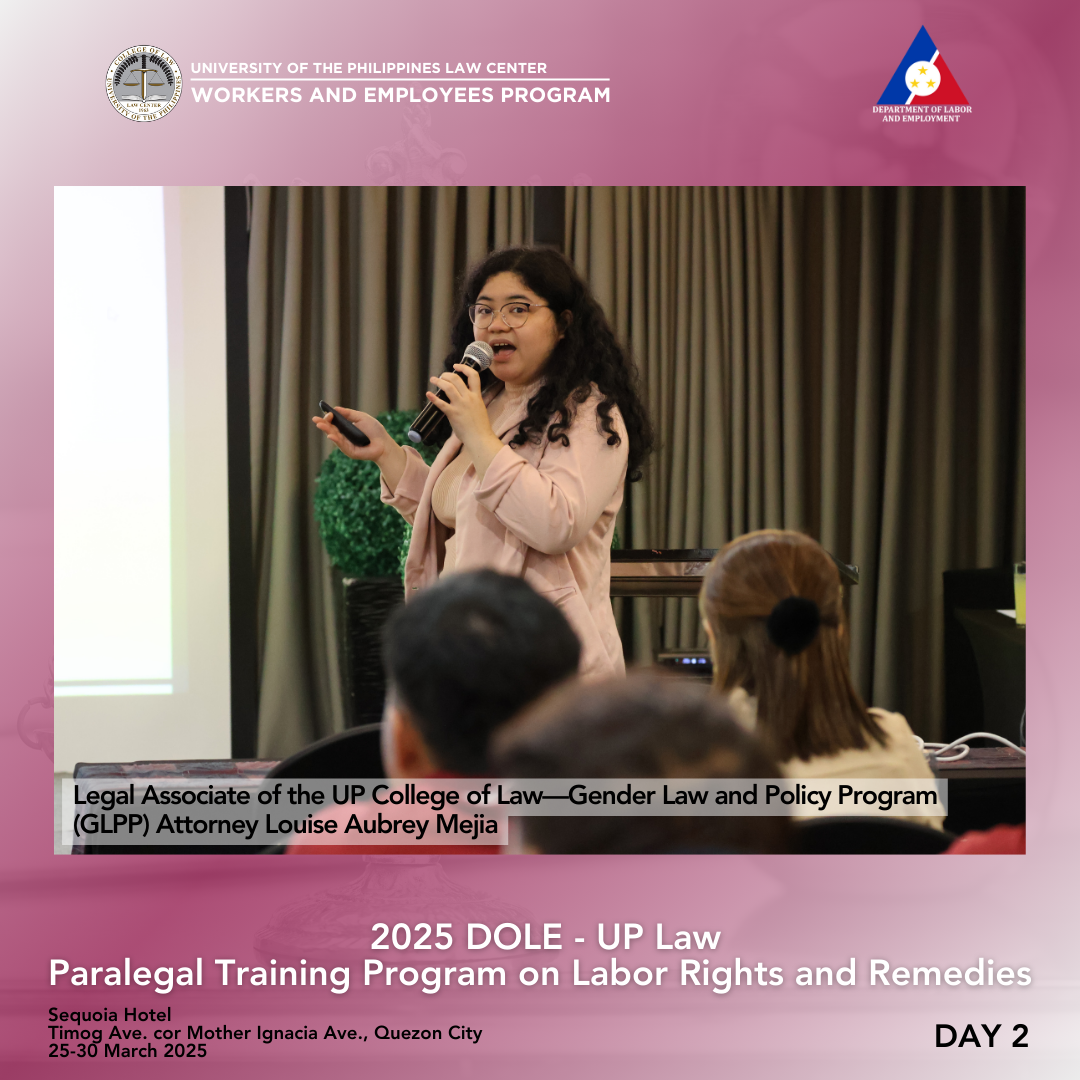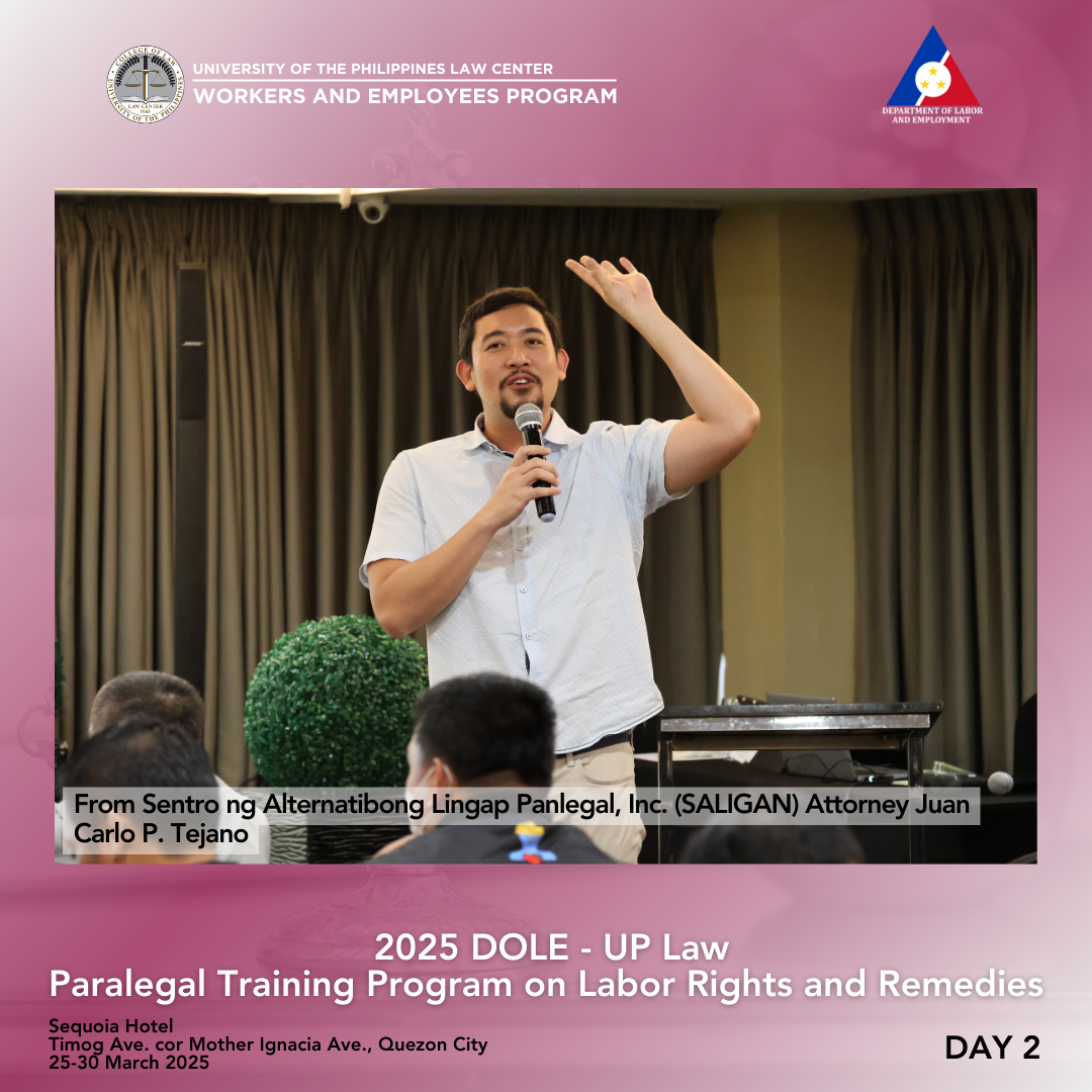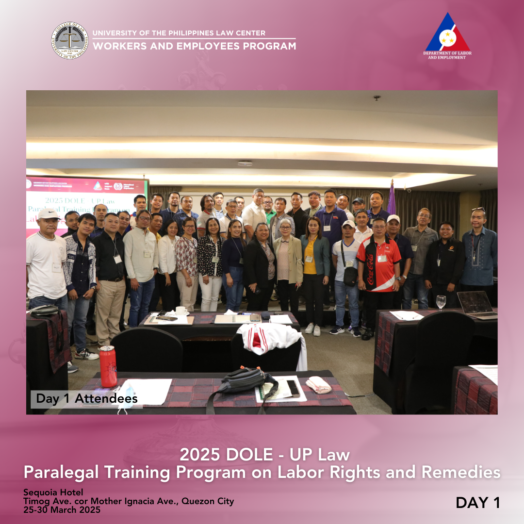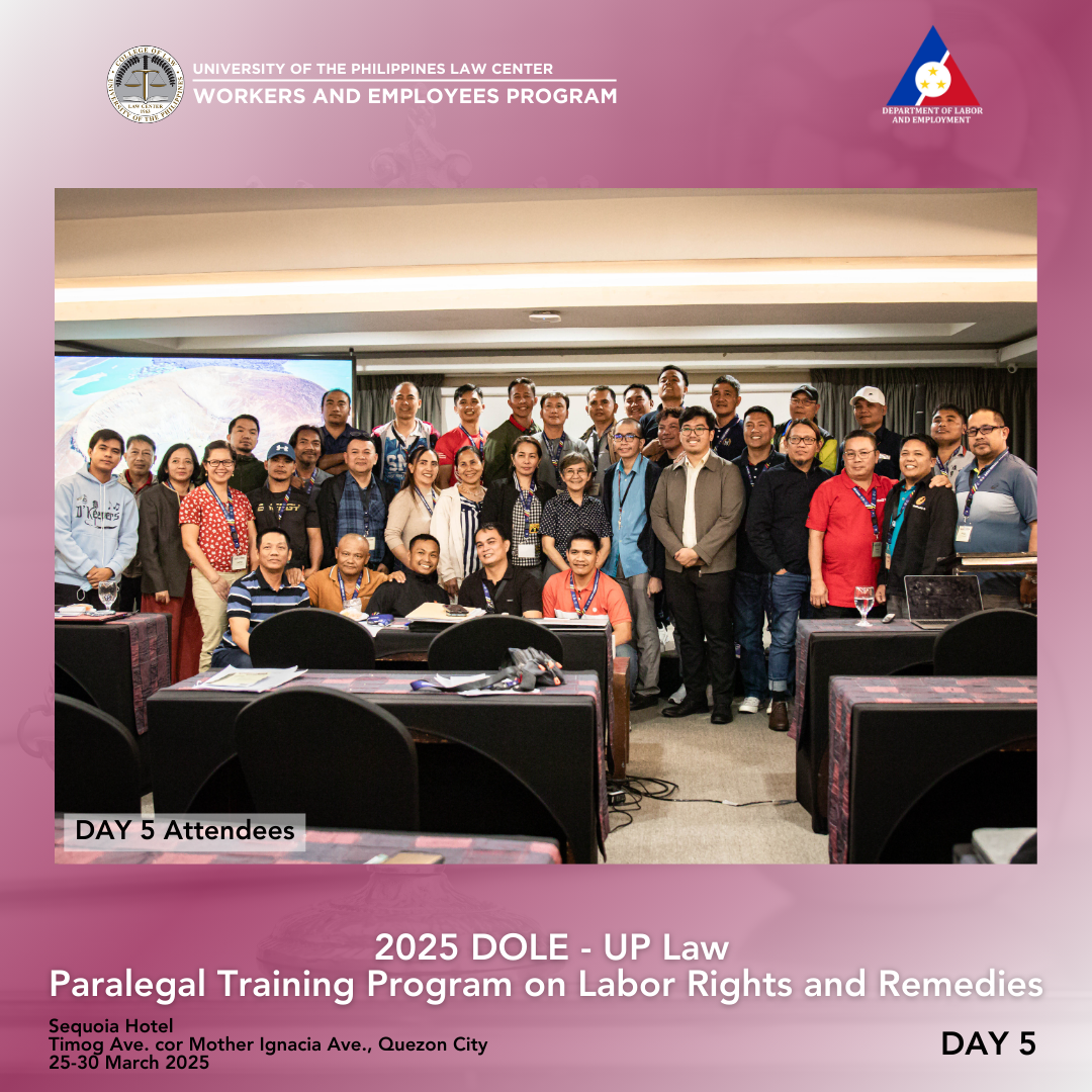 Thirty-six (36) participants from the Cordillera Administrative Region, Regions I, II, and III completed the 3rd round of the Department of Labor and Employment (DOLE)–University of the Philippines (UP) College of Law Paralegal Training Program on Labor Rights and Remedies held in Sequoia Hotel, Timog Avenue corner Mother Ignacia Avenue, Quezon City, last 25-30 March 2025. Pursuant to the 23 August 2023 Memorandum of Agreement between the DOLE, UP College of Law, and UP Law Center, the training was a gender-sensitive paralegal program for workers, capacitating them with knowledge of various legal remedies available to them, as well as case build-up skills so that they can help provide relevant information and/or evidence to establish an airtight case against perpetrators of violence committed against their ranks. The six-day training was again conducted by the Bureau of Labor Relations (BLR), DOLE, and the UP Law Center Workers and Employees Program (WEP).
