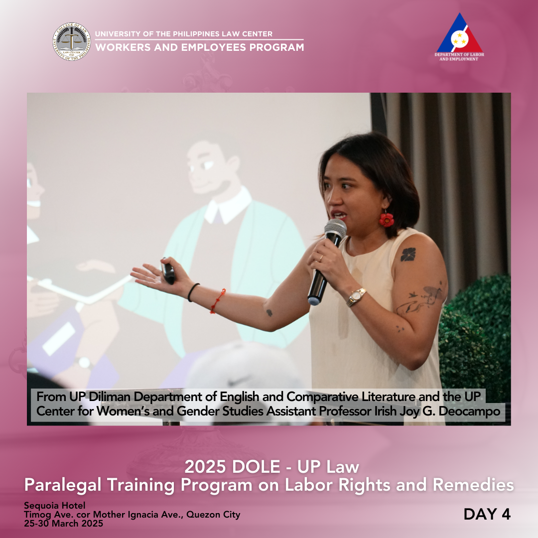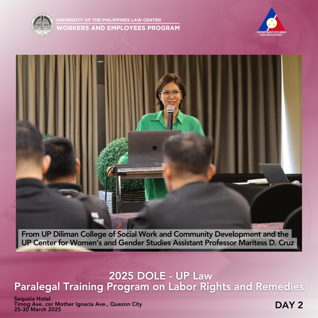 Assistant Professor Maritess D. Cruz of UP Diliman College of Social Work and Community Development and the UP Center for Women’s and Gender Studies illustrated the need to examine the relationship between gender and society. The aim was to understand gender sensitivity and identify gender-related labor issues, as well as the policies and international instruments that address them. Key gender issues at work were discriminatory hiring policies and practices, gender division of labor, gender pay gap, and gender violence.