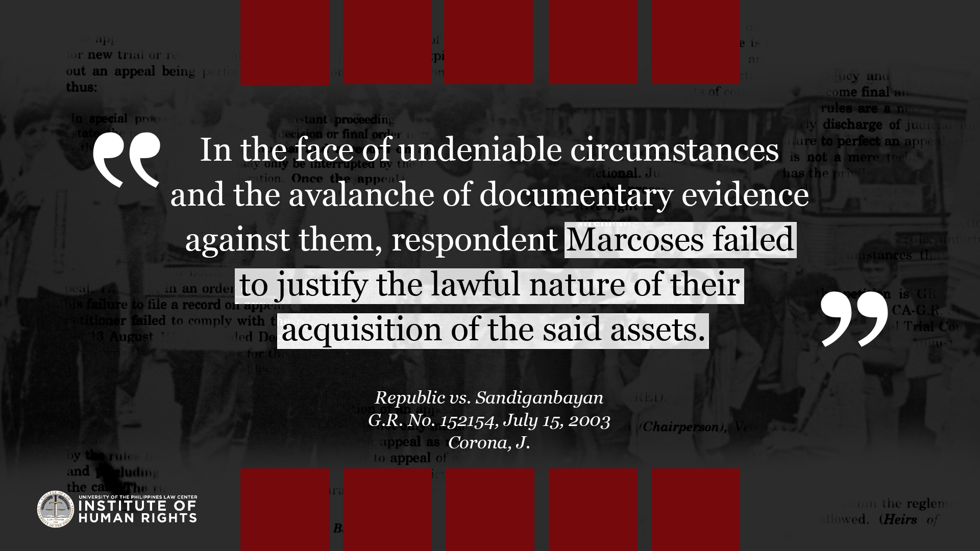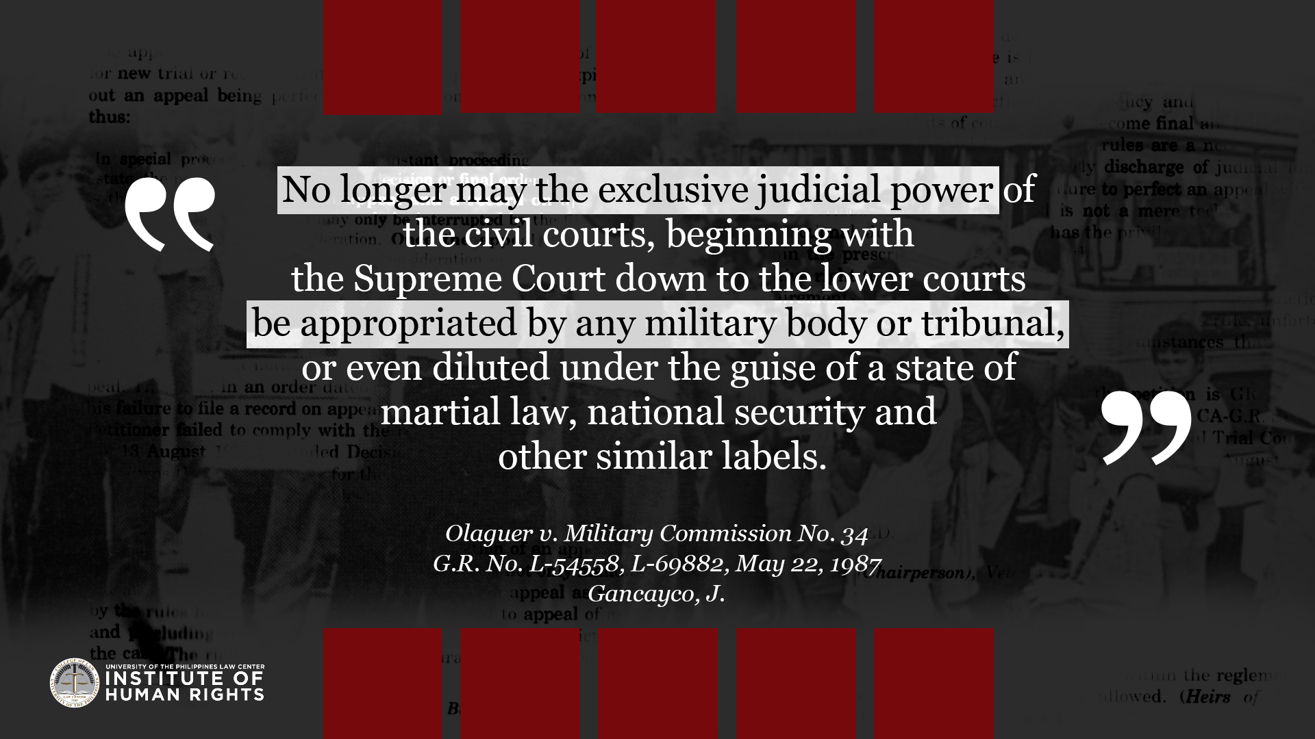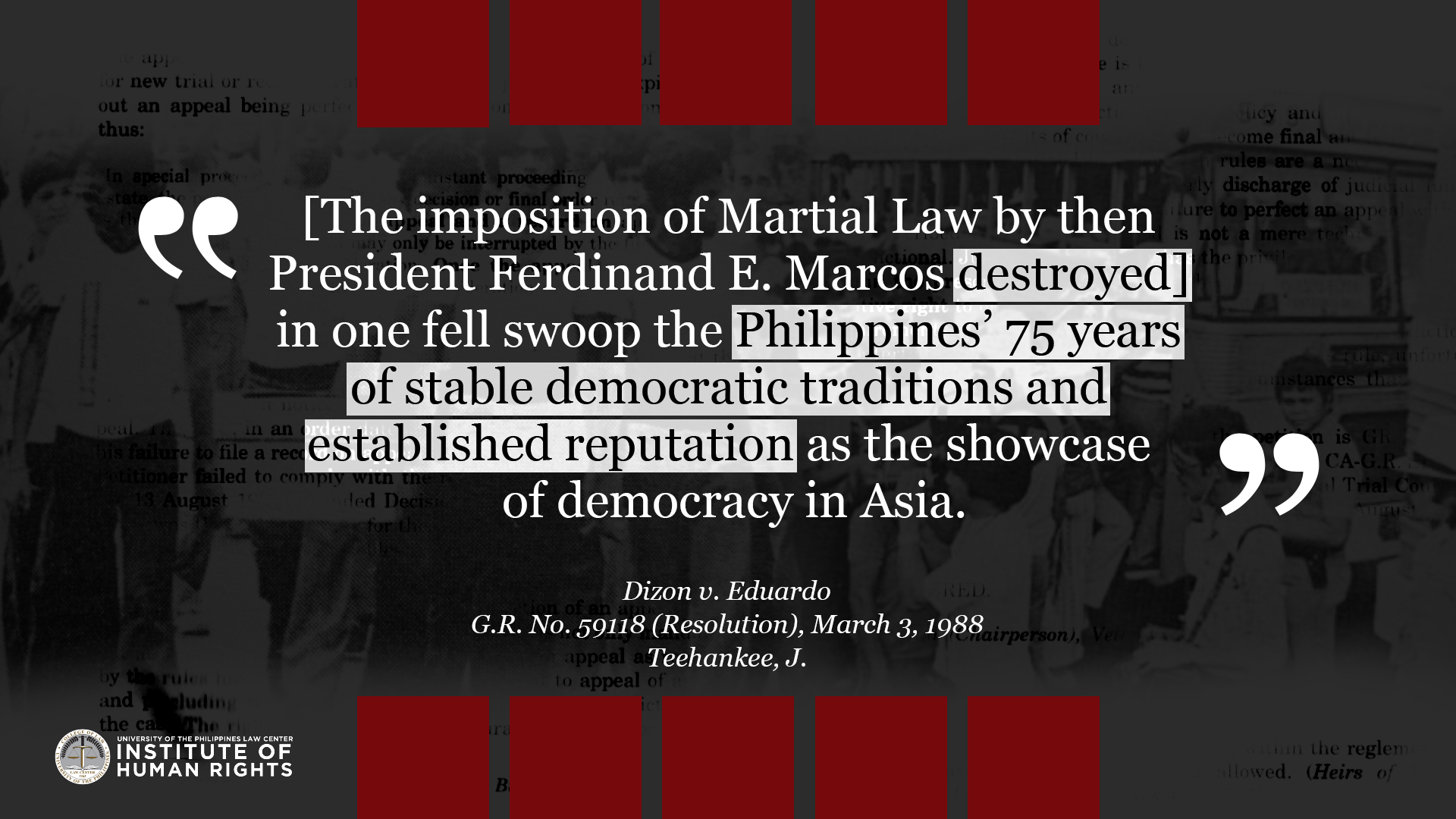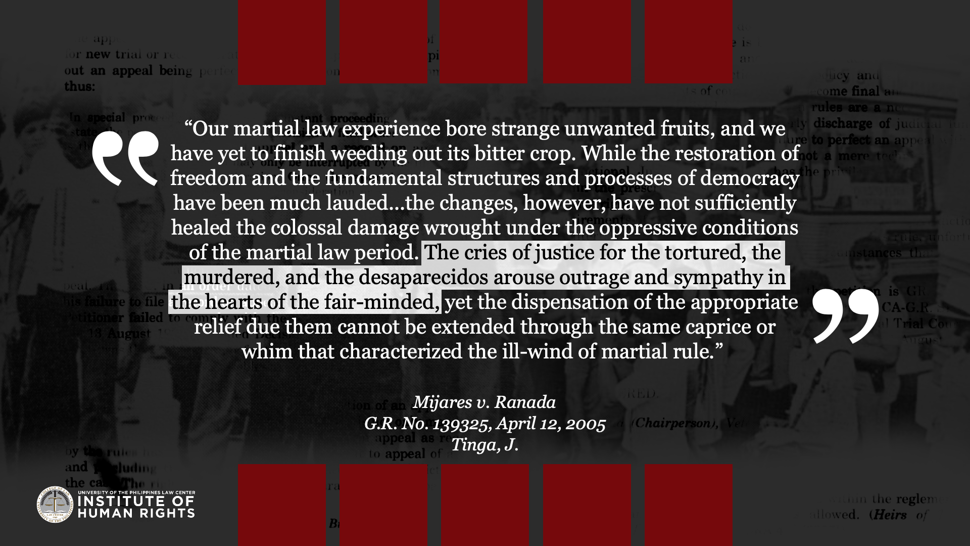 Legal truths are determined to serve justice. They are ascertained by a judge through a court trial which is governed by procedural and evidentiary rules. They are truths that relate to past events because the legal system is deciding matters of past fact in relation to an actual controversy. This album compiles quotes from Supreme Court cases related to Martial Law and the Marcos dictatorship, with the aim to commemorate the experiences of the victims of human rights violations during the Marcos Regime, and show how the Judiciary resolved them under the rule of law. The UP IHR joins the nation in remembering the 49th anniversary of the declaration of martial law, and the sacrifices of the Filipino people in the struggle against tyrannical rule and oppression.