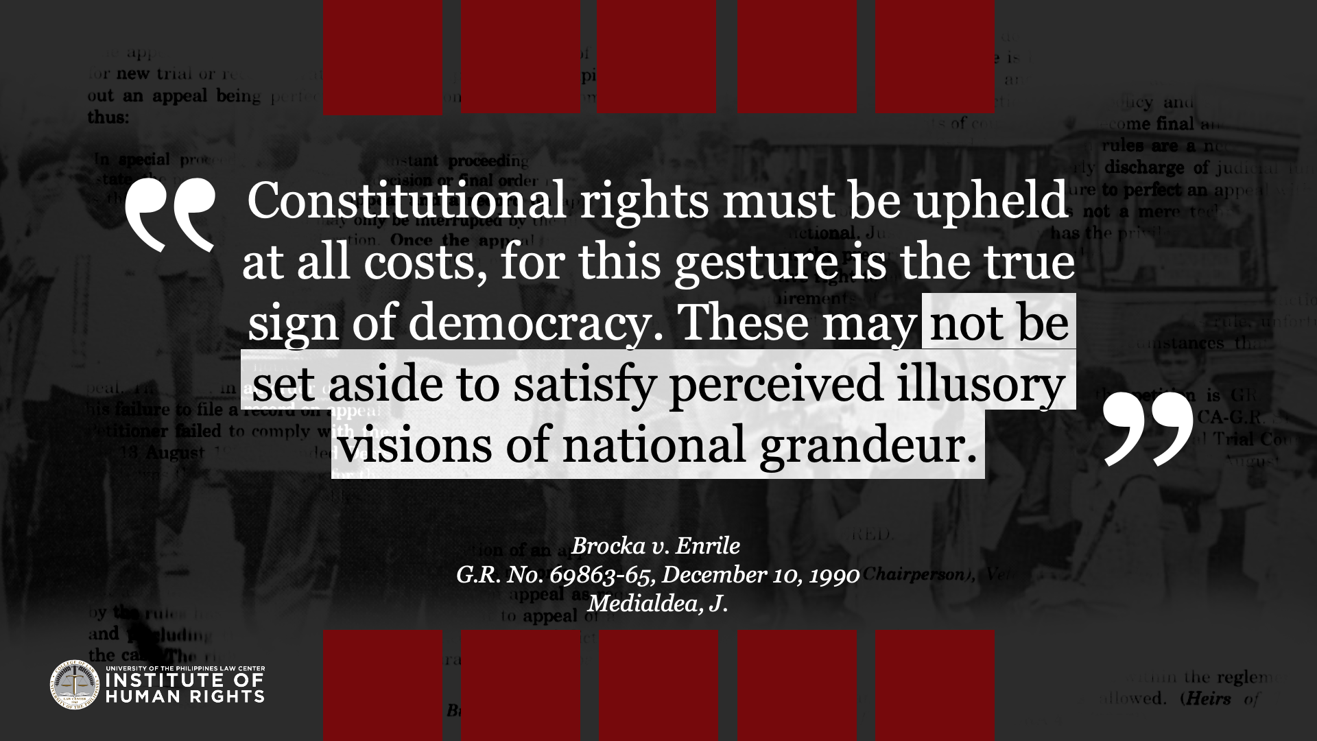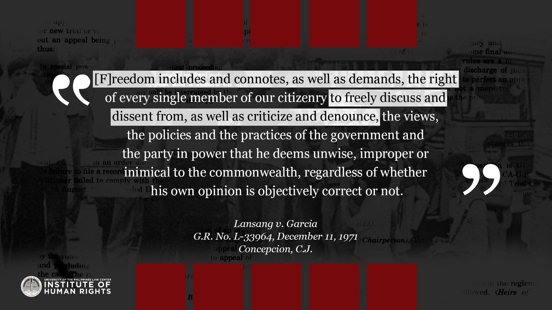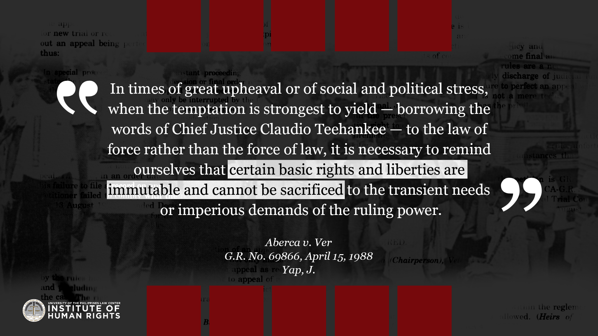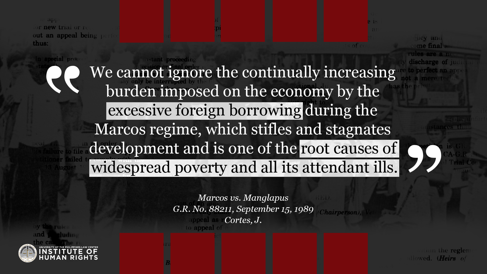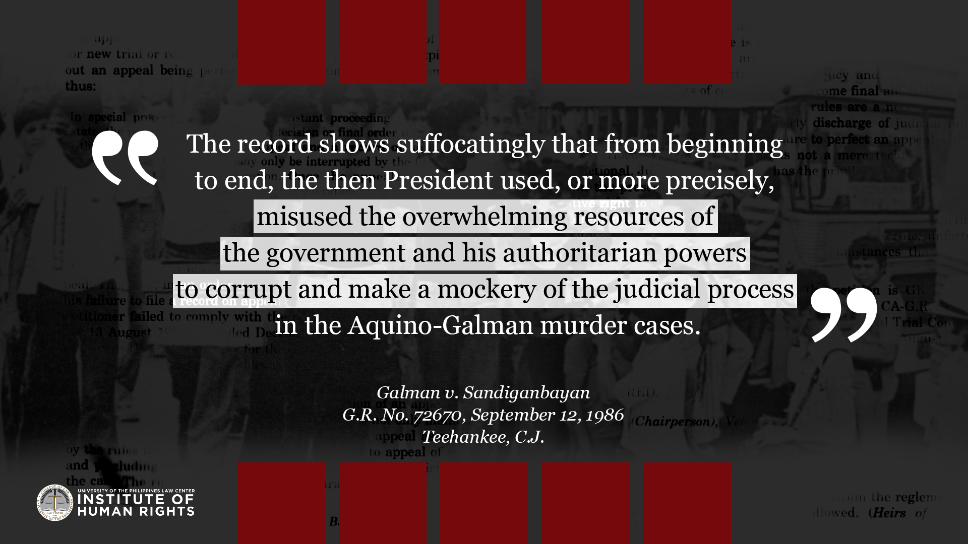 Legal truths are determined to serve justice. They are ascertained by a judge through a court trial which is governed by procedural and evidentiary rules. They are truths that relate to past events because the legal system is deciding matters of past fact in relation to an actual controversy. This album compiles quotes from Supreme Court cases related to Martial Law and the Marcos dictatorship, with the aim to commemorate the experiences of the victims of human rights violations during the Marcos Regime, and show how the Judiciary resolved them under the rule of law. The UP IHR joins the nation in remembering the 49th anniversary of the declaration of martial law, and the sacrifices of the Filipino people in the struggle against tyrannical rule and oppression.