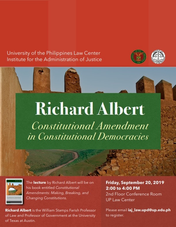 On September 20, Professor Richard Albert of the University of Texas at Austin delivered a lecture entitled “Constitutional Amendments in Constitutional Democracies.” The UP Law Center’s Institute for the Administration of Justice invited Prof. Albert to deliver the lecture which was based on his recent publication, “Constitutional Amendments: Making, Breaking, and Changing Constitutions” (Oxford University Press 2019). Prof. Albert discussed themes that inform debates on constitutional change. These are “transformation” (when an amendment might be a dismemberment of the constitution), “eternity” (the use of unamendable provisions), and “illusion” (issues on the need to follow the formal rules for amendment).