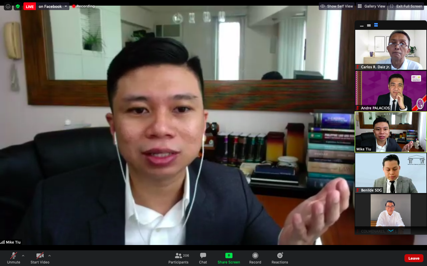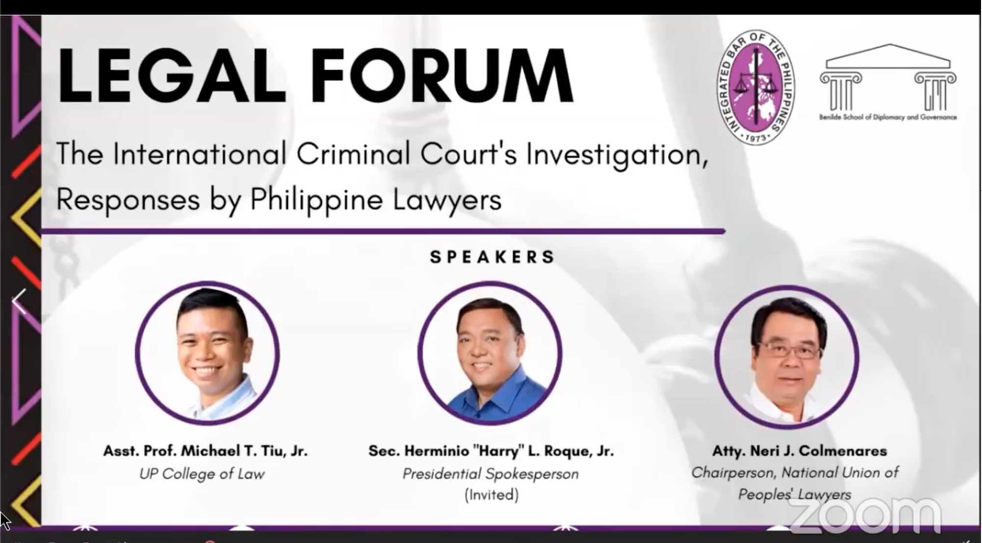 On 06 October 2021, Asst. Prof. Michael T. Tiu, Jr. – Head of the International Criminal Law Program of the UP Institute of International Legal Studies (UP IILS), took part in a webinar entitled Legal Forum: The International Criminal Court’s Investigation, Responses by Philippine Lawyers organized by the Integrated Bar of the Philippines International Law Committee (IBP ILC). The webinar was moderated by Asst. Prof. Andre C. Palacios who is Chairperson of the IBP International Law Committee, and Mr. John Paul Mondejar of the Benilde School of Diplomacy and Governance. The forum also featured Atty. Neri Colmenares, the Chairman of the National Union of People’s Lawyer (NUPL). Secretary Herminio “Harry” L. Roque Jr. was invited, but he was unable to join the forum.