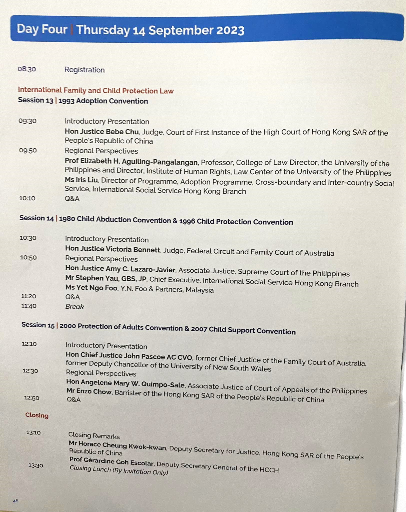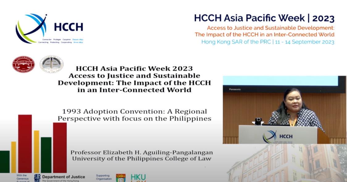 On 14 September 2023, Professor Elizabeth H. Aguiling-Pangalangan took part in the Hague Conference on Private International Law’s (HCCH) Asia Pacific Week (APW) 2023 held at the Hong Kong University on 11-14 September 2023. She presented an overview of the implementation and enforcement of the 1993 Adoption Convention in four Southeast Asian countries, with a specific focus on the Philippines. The HCCH celebrated its 130th Anniversary during the Asia Pacific Week with the theme “Access to Justice and Sustainable Development: The Impact of the HCCH in an Inter-Connected World.”