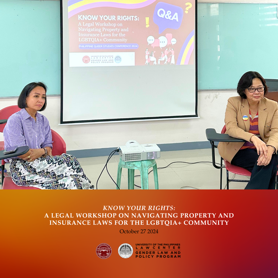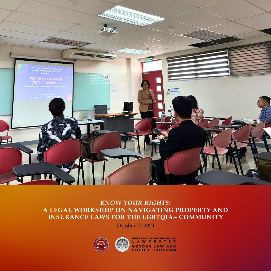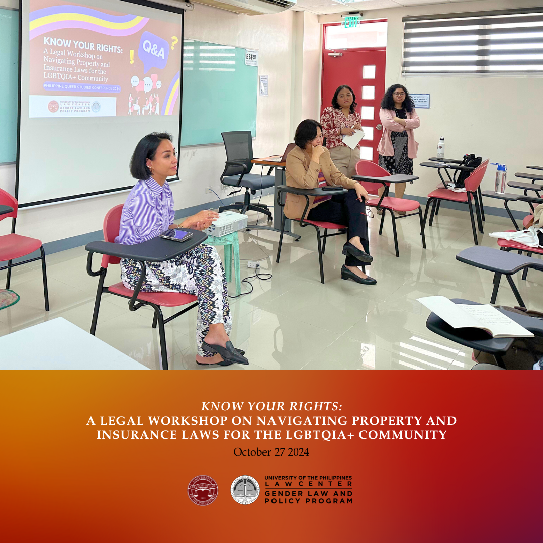 The UP Gender Law and Policy Program (UP GLPP) organized and conducted a legal workshop titled, “Know Your Rights: A Legal Workshop on Navigating Property and Insurance Laws for the LGBTQIA+ Community.” This was part of the lineup of events for the 2nd Philippine Queer Studies Conference (PQSC 2024) held last October 27, 2024 at the UP School of Statistics, UP Diliman.