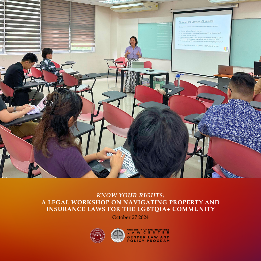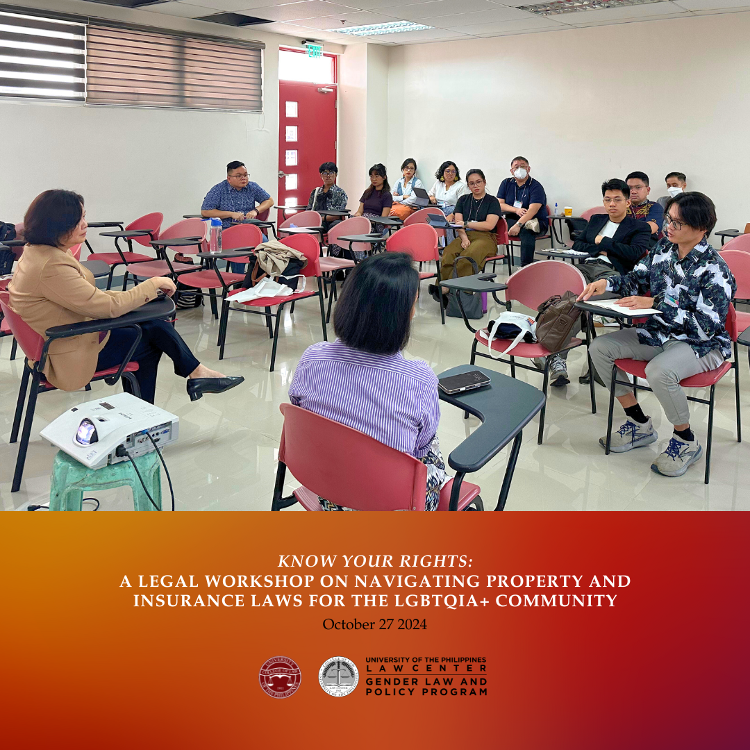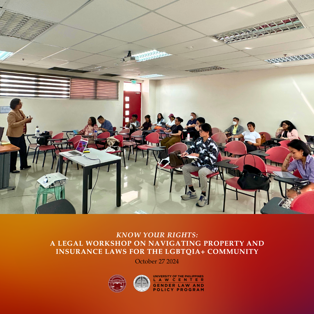 The UP Gender Law and Policy Program (UP GLPP) organized and conducted a legal workshop titled, “Know Your Rights: A Legal Workshop on Navigating Property and Insurance Laws for the LGBTQIA+ Community.” This was part of the lineup of events for the 2nd Philippine Queer Studies Conference (PQSC 2024) held last October 27, 2024 at the UP School of Statistics, UP Diliman.