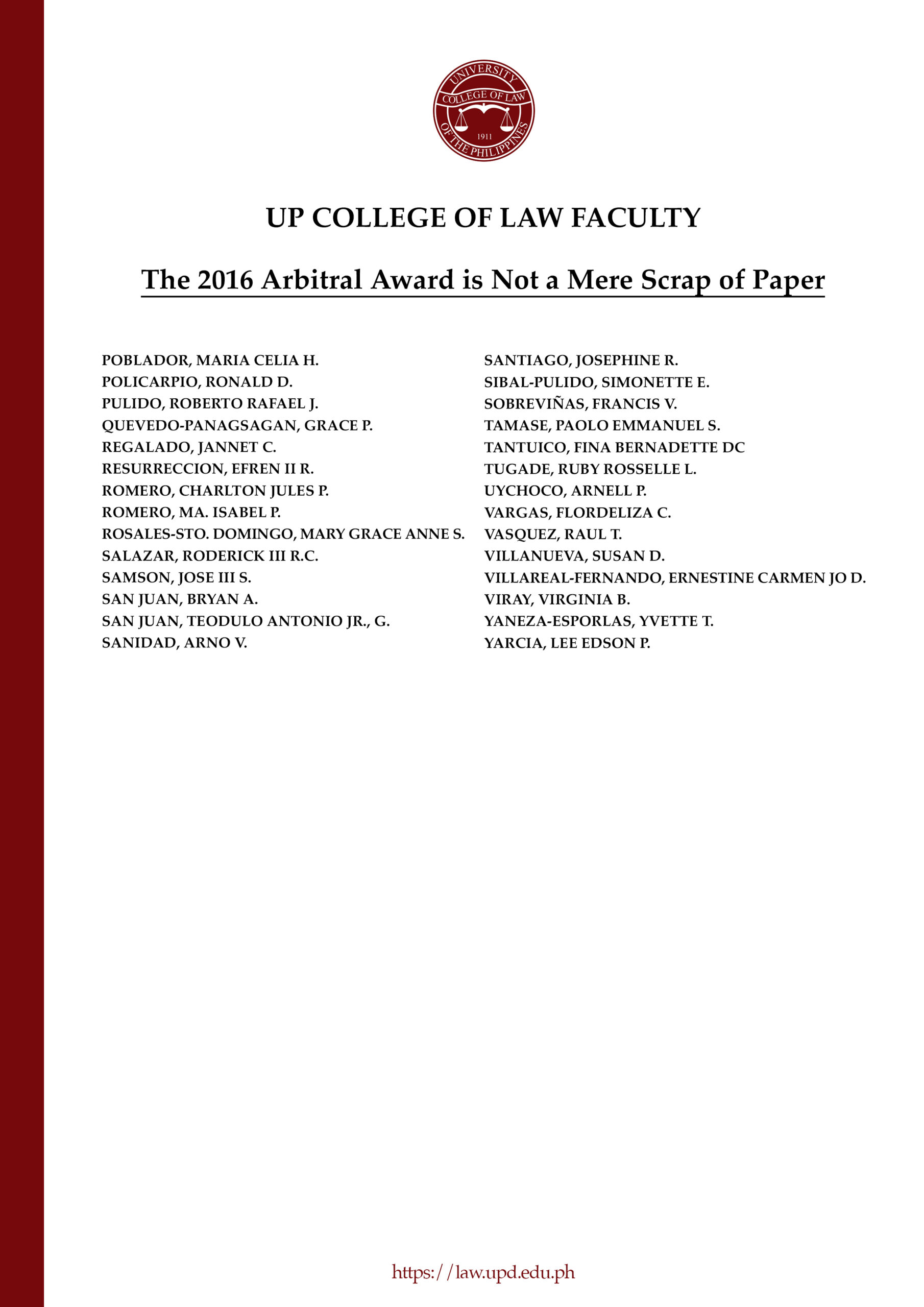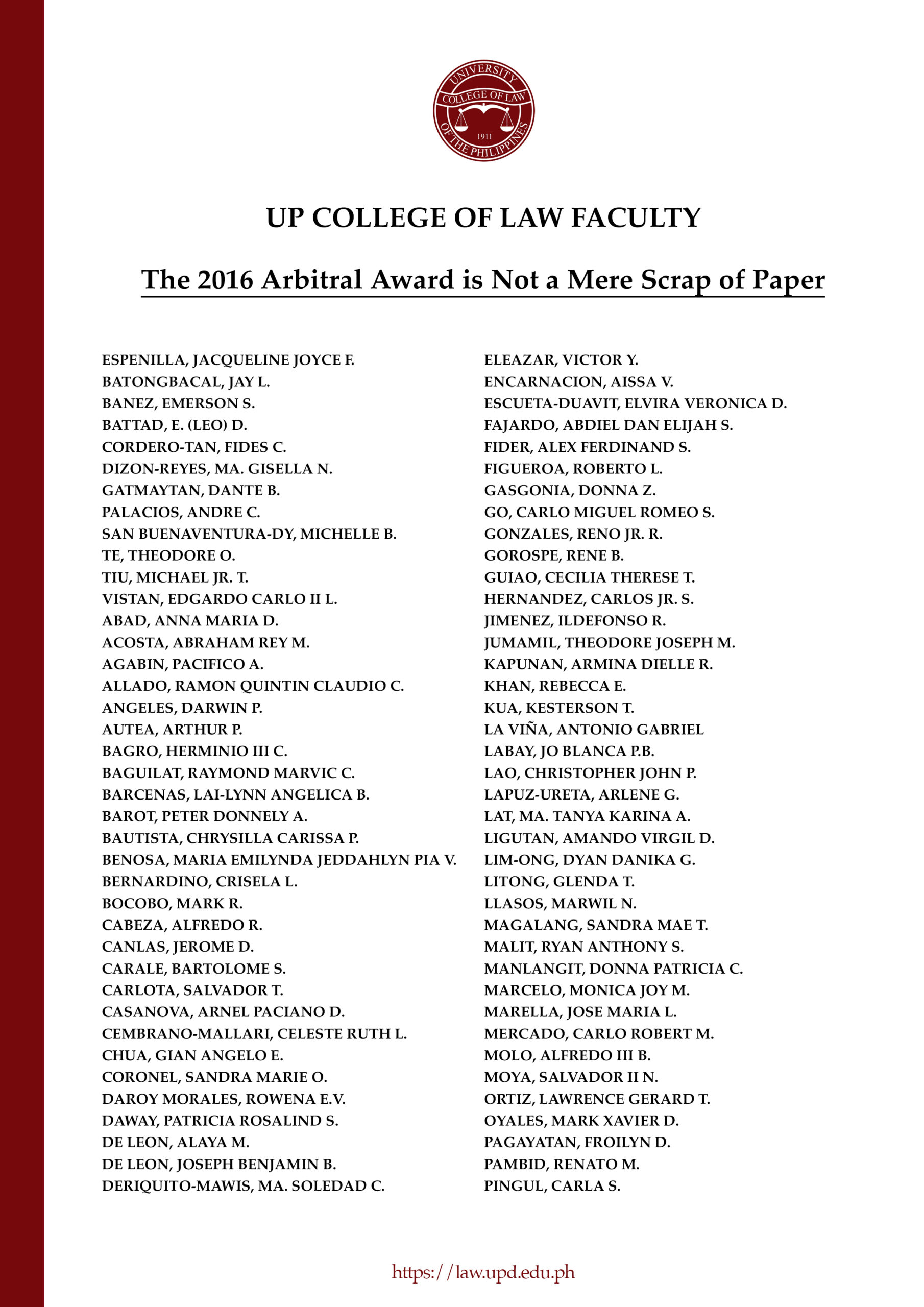 We, the undersigned faculty of the University of the Philippines College of Law, in reference to the statements made by President Rodrigo Roa Duterte that the 2016 Arbitral Award is a mere scrap of paper that should be “thrown to the wastebasket,” that China is “in possession” of the West Philippine Sea (WPS), and that Chinese fishermen are free to fish in the Philippines’ Exclusive Economic Zone (EEZ), respectfully state: