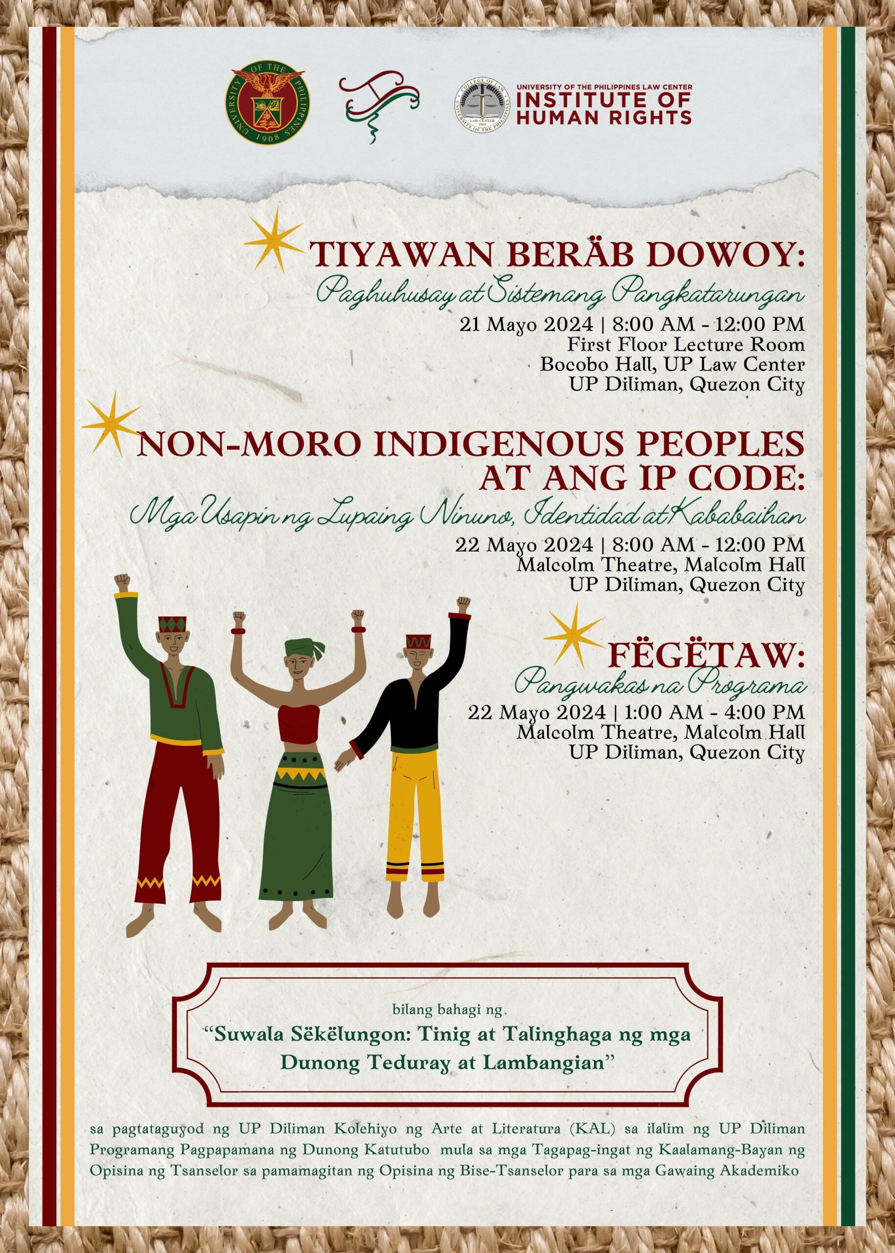 Inihahandog ng UP Law Center Institute of Human Rights (UP IHR), sa pakikipagtulungan ng UP Kolehiyo ng Arte at Literatura, ang serye ng Panayam-Talakayan na gaganapin sa ika-21 at 22 ng Mayo 2024 mula 8:00 ng umaga hanggang 12:00 ng tanghali. Ang unang bahagi na pinamagatang “Tiyawan bërab Dowoy: Paghuhusay at Sistemang Pangkatarungan,” ay gaganapin sa ika-21 ng Mayo sa 1st Floor Lecture Room, Bocobo Hall, UP Law Center, UP Diliman. Ang ikalawang bahagi ng serye na pinamagatang “Non-Moro Indigenous Peoples at ang IP Code: Identidad, Bayan, at Kababaihan sa BARMM,” ay gaganapin naman sa ika-22 ng Mayo sa Malcolm Theater, Malcolm Hall, UP College of Law, UP Diliman.