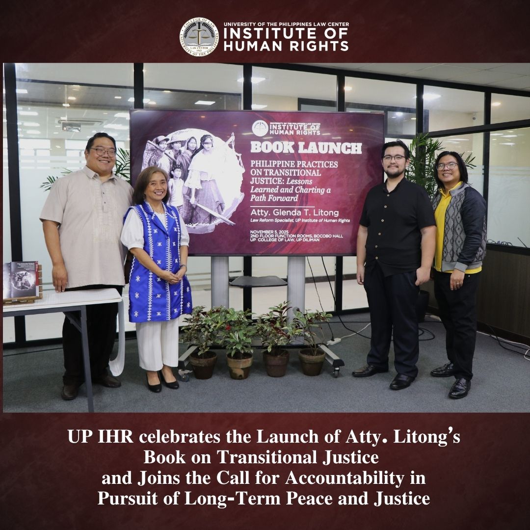 The UP Law Center Institute of Human Rights officially launched Senior Law Reform Specialist Atty. Glenda T. Litong’s latest publication, “Philippine Practices on Transitional Justice: Lessons Learned and Charting a Path Forward” in a dialogue with scholars, policymakers, and human rights advocates on November 5, 2025.