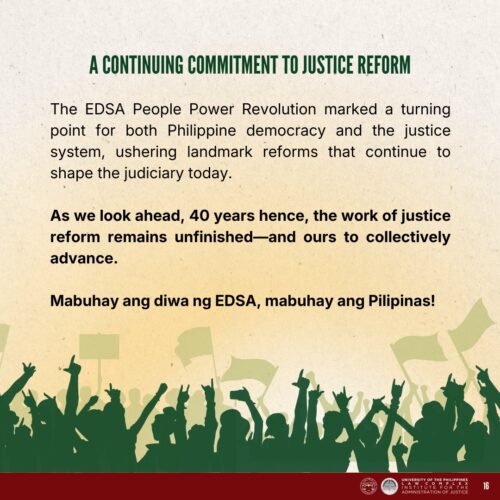 Marking 40 years since, the UP Institute for the Administration of Justice draws from the archives of the Judges’ Journal (a former UP Law Center publication) to spotlight the select reforms that defined and reshaped the Philippine judiciary in the post-EDSA era.