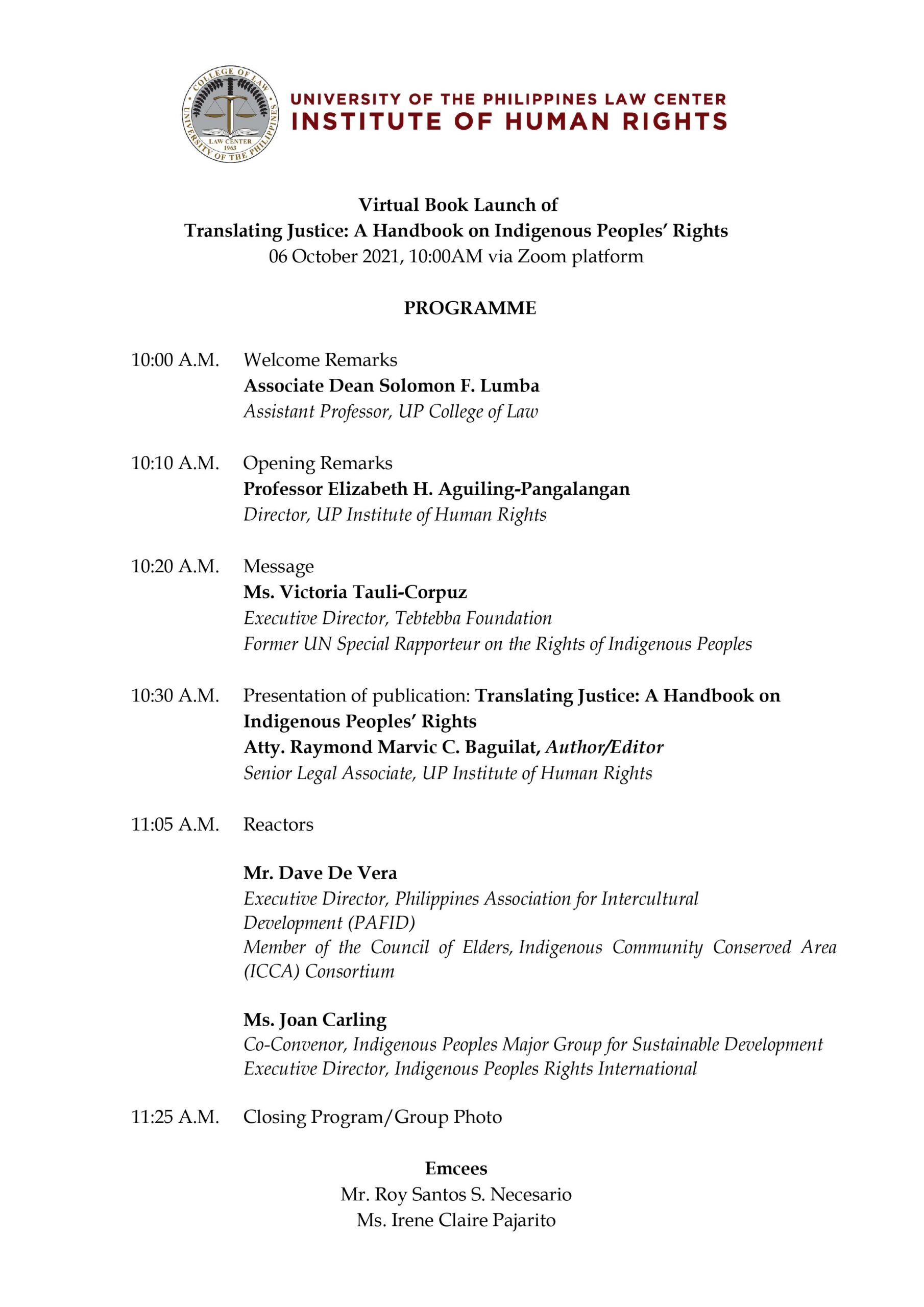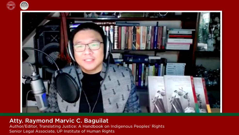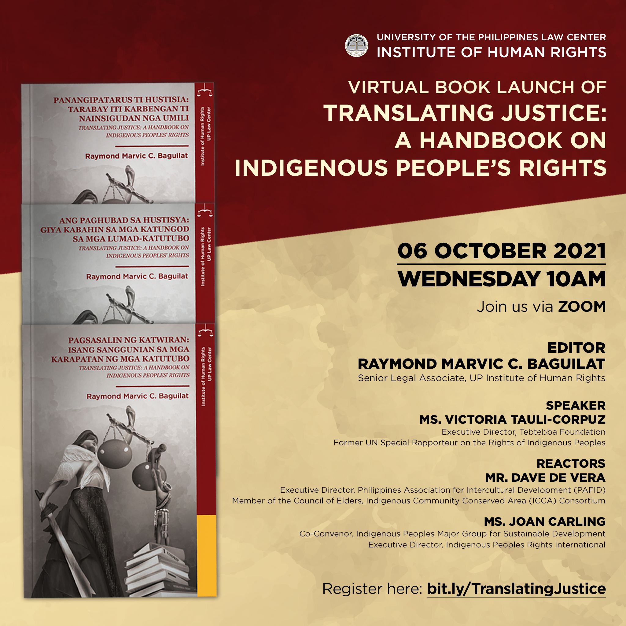 On 6 October 2021, the UP Institute of Human Rights (UP IHR), in celebration of the Indigenous Peoples Month, launched “Translating Justice: A Handbook on Indigenous Peoples’ Rights.” The book provides translations of the Indigenous People’s Rights Act of 1997 (IPRA, Republic Act No. 8371), United Nations Declaration on the Rights of Indigenous Peoples (UNDRIP), and the Implementing Rules and Regulations of the IPRA into Tagalog, Sugbuanon and Iloco. Tuwali Ifugao lawyer and IHR Senior Legal Associate Atty. Raymond Marvic Baguilat, spearheaded this initiative to help address existing legal gaps and the lack of access to justice of Indigenous Peoples throughout the country.