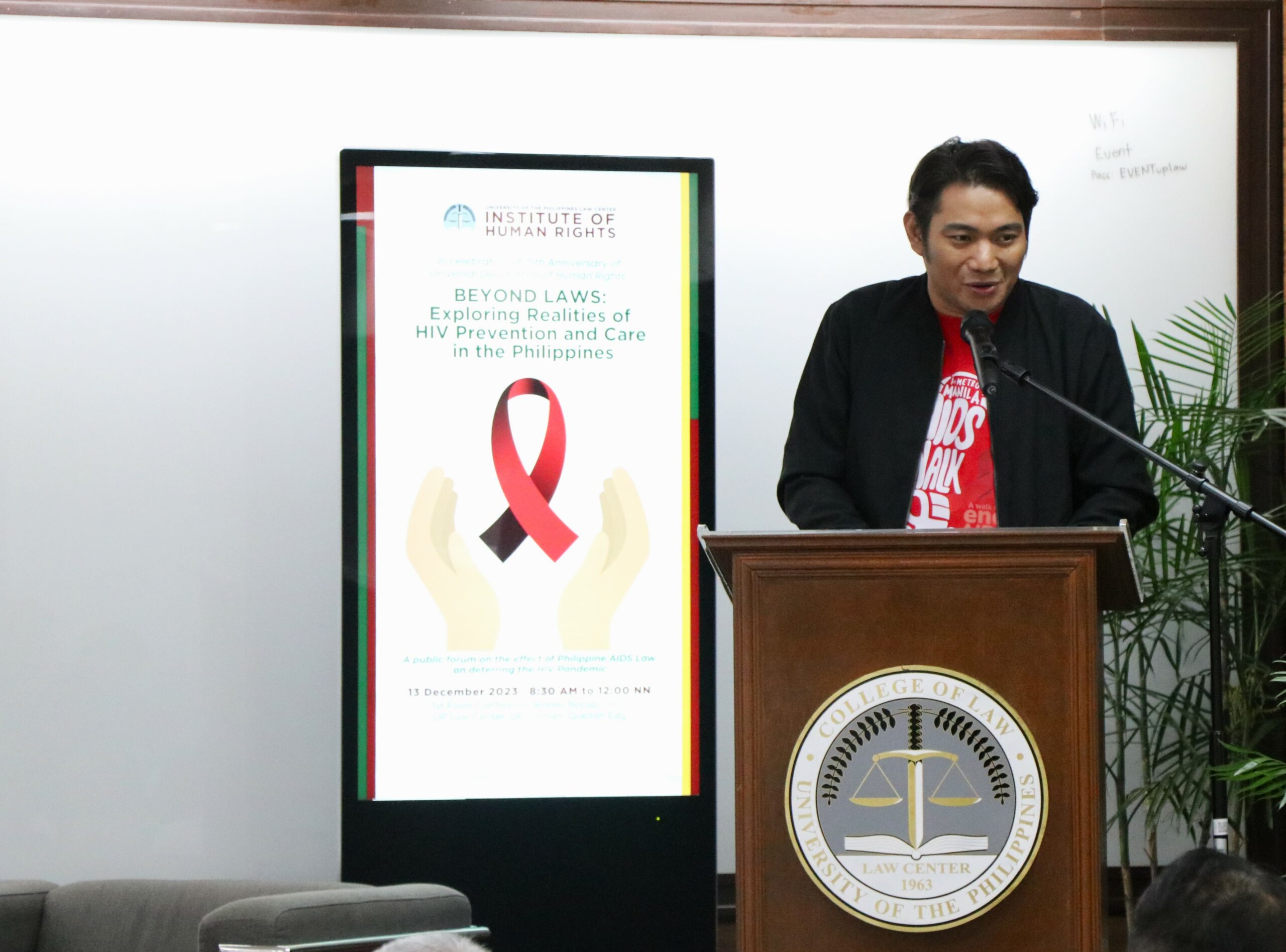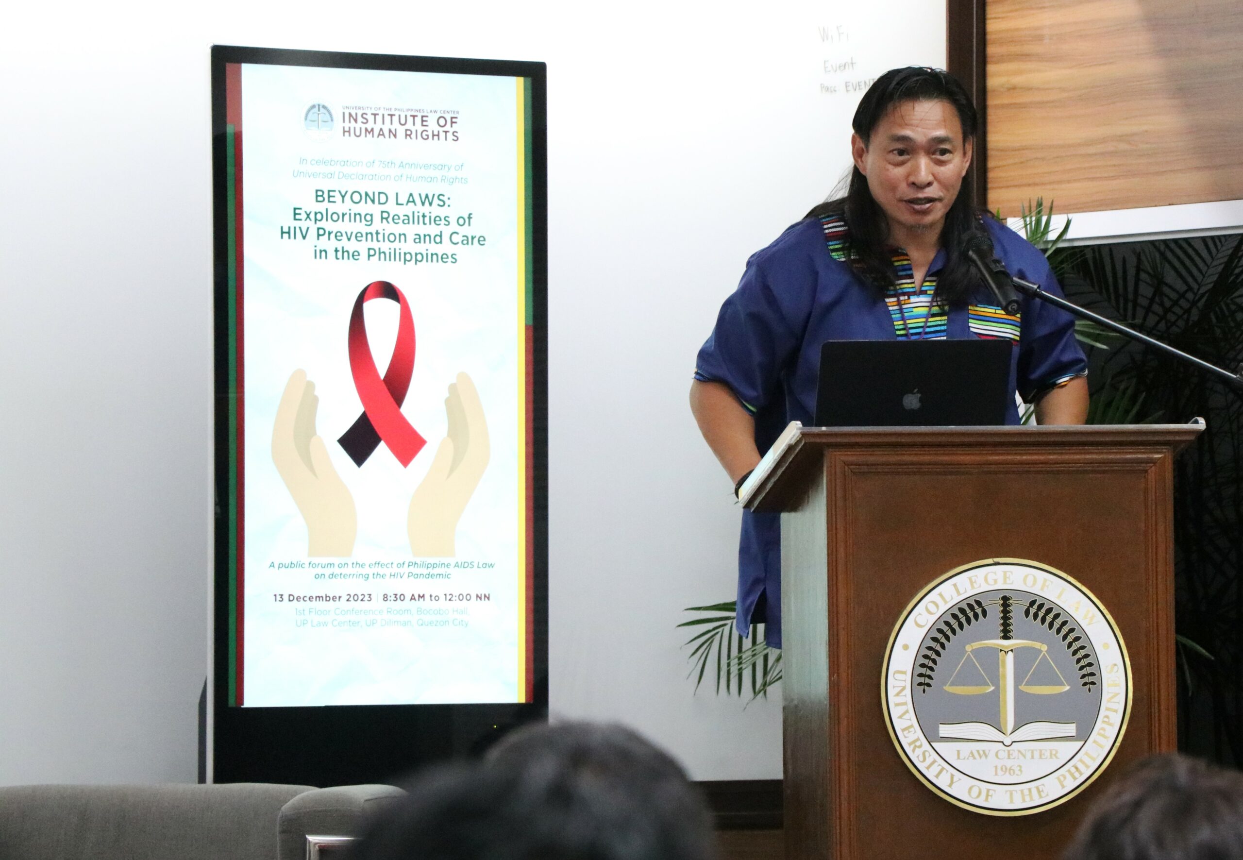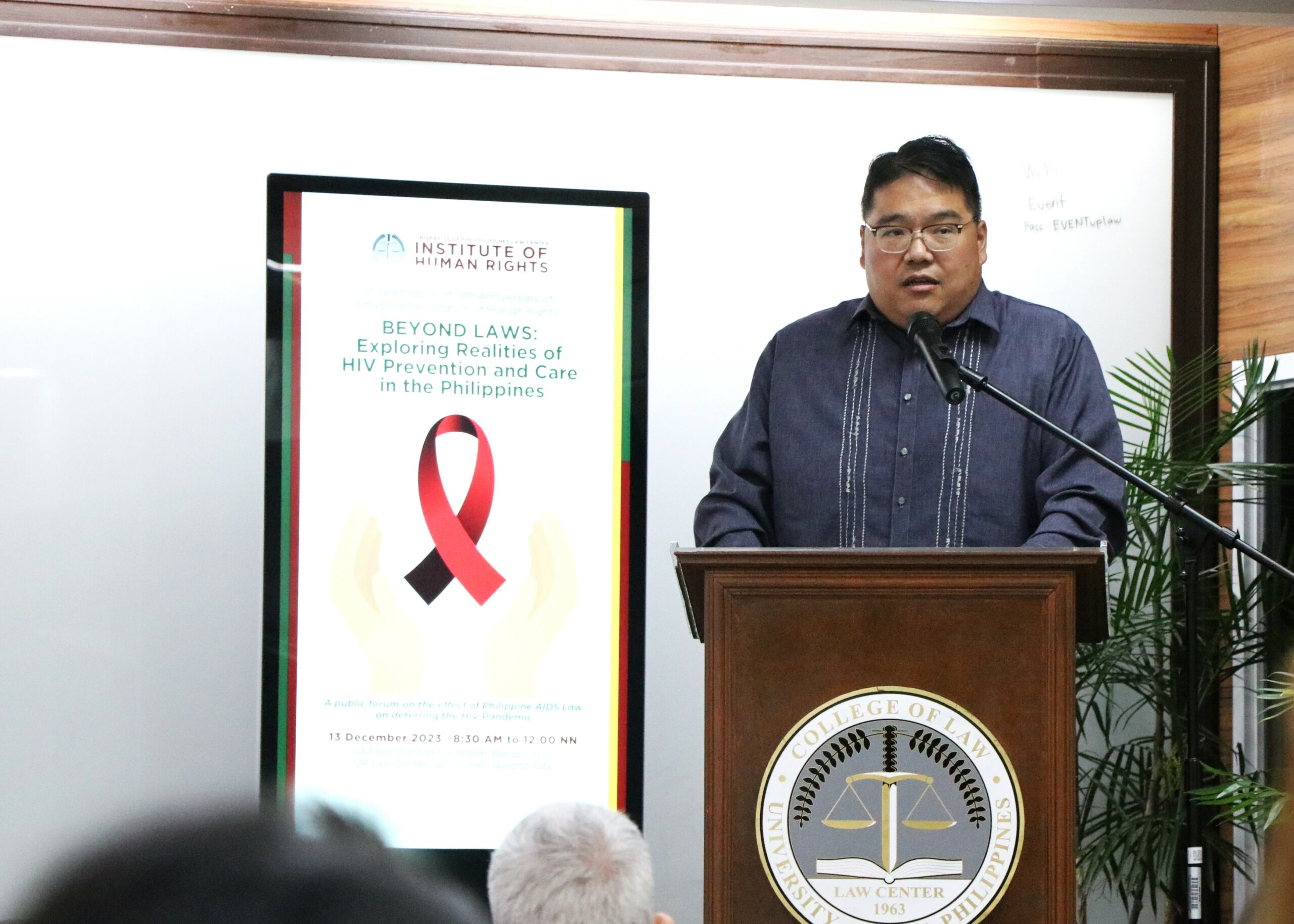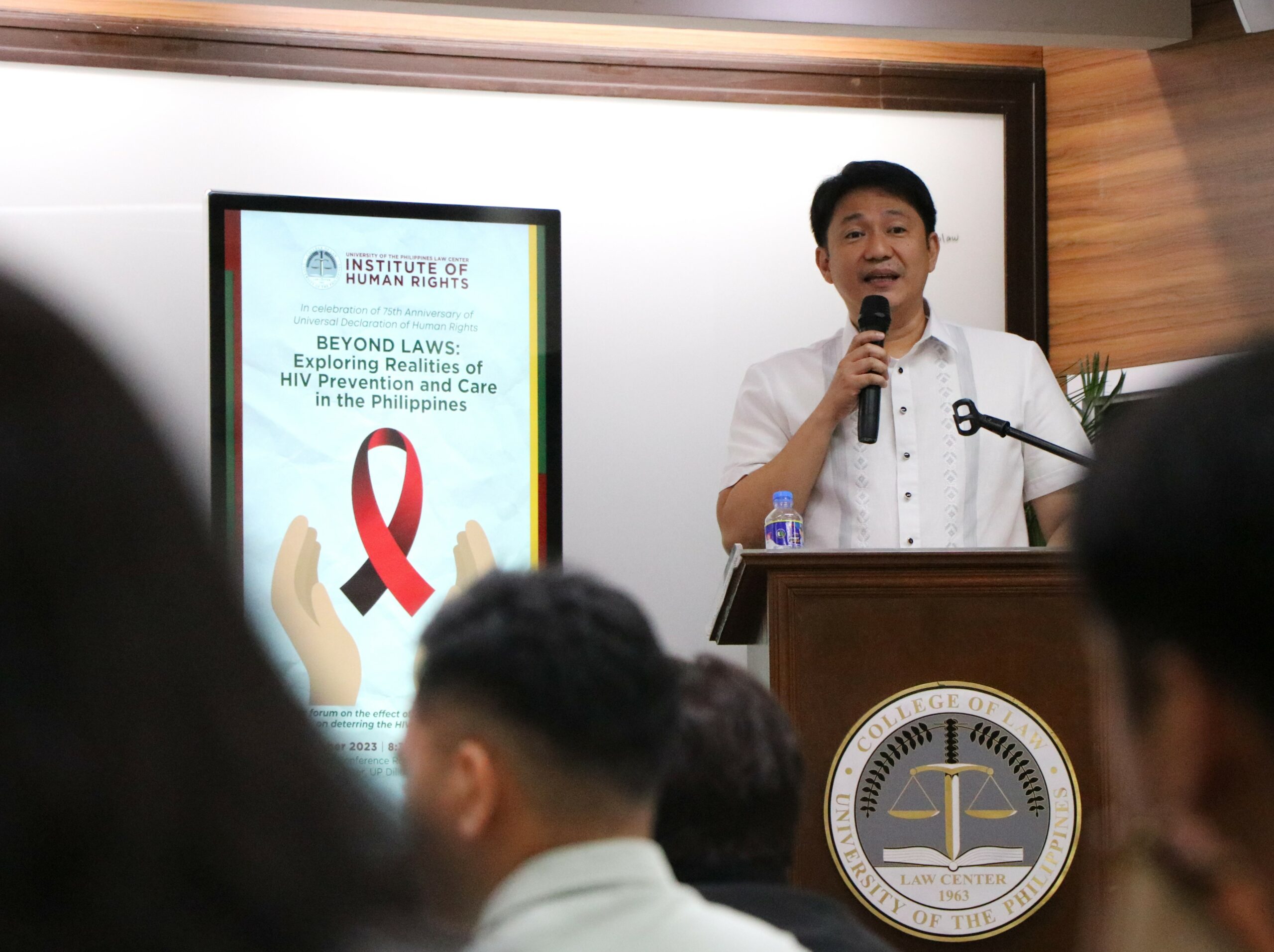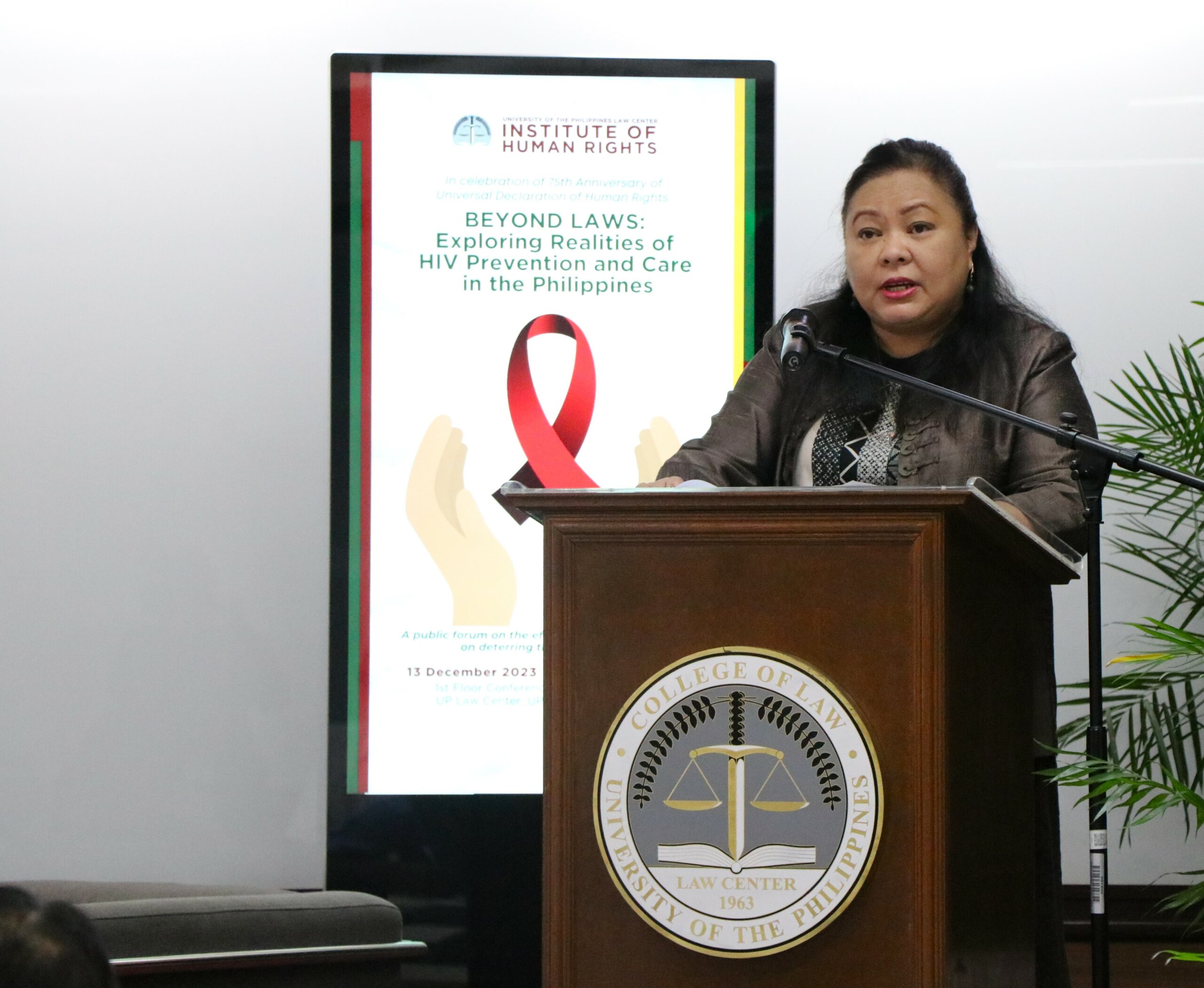 On 13 December 2023, The UP Law Center Institute of Human Rights (UP IHR) conducted a public forum on human immunodeficiency virus (HIV) titled “Beyond Laws: Exploring Realities of HIV Prevention and Care in the Philippines.” Launched in celebration of the 75th anniversary of the Universal Declaration of Human Rights (UDHR), the event was attended by representatives from the American Bar Association Rule of Law Initiative (ABA ROLI), Caloocan City Health Department, Department of Health Epidemiology Bureau, Department of Social Work and Development (DSWD), San Lazaro Hospital HIV/Aids Department, UP Diliman Health Service, UP Diliman Journalism Department, and the Red Whistle, among others.