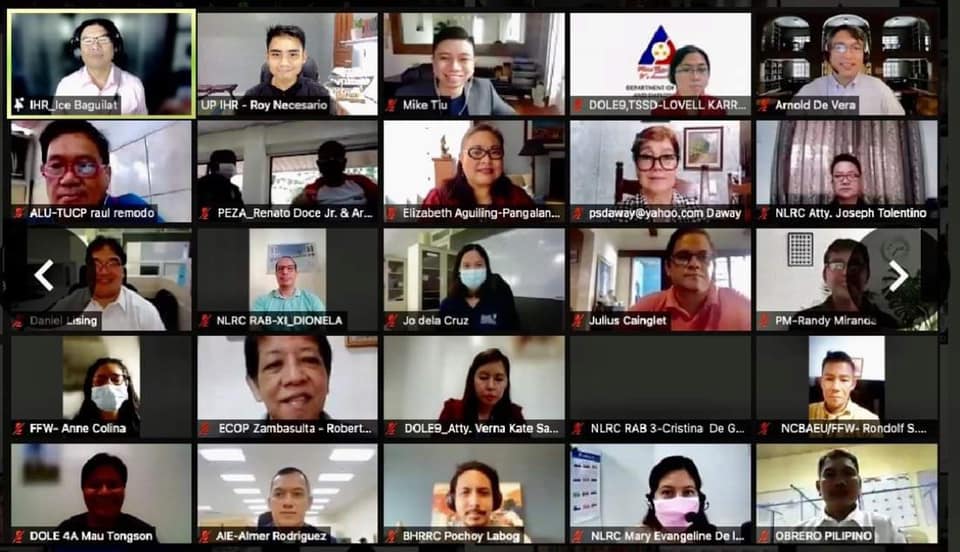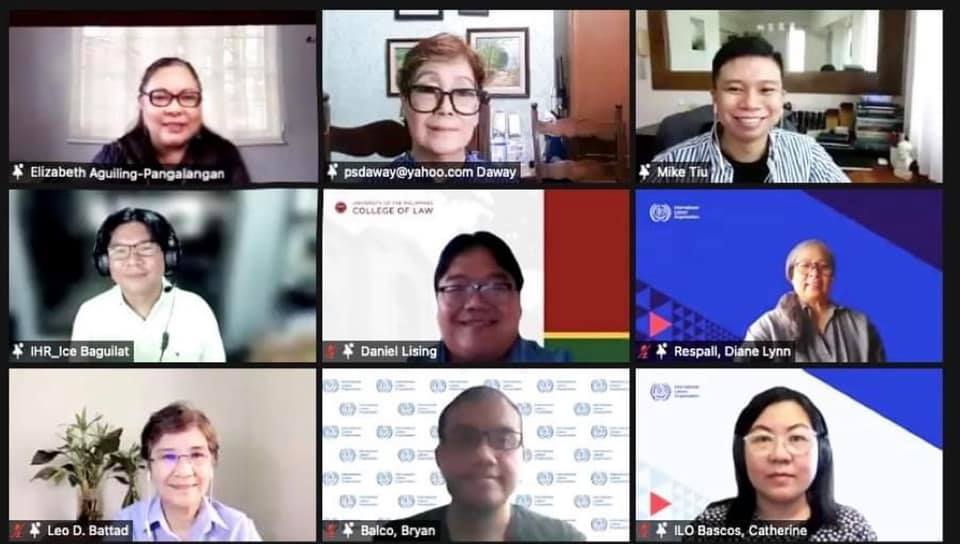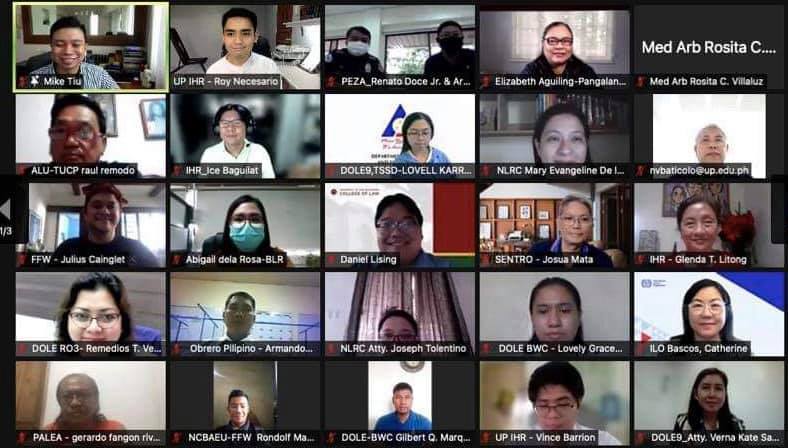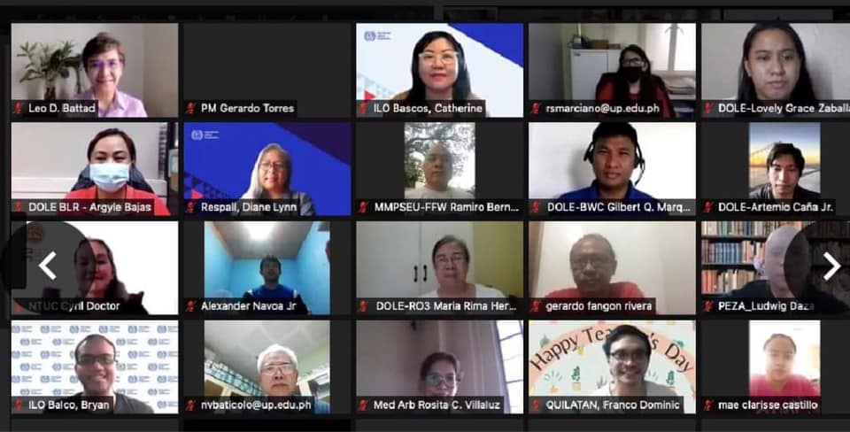 On 7-8 October 2021, the UP Institute of Human Rights (IHR), together with the Foundation for Integrative and Development Studies, International Labour Organization (ILO), and European Union in the Philippines conducted two capacity building workshops on freedom of association (FoA) and mechanisms that address FoA issues for the Department of Labor and Employment, Philippine Economic Zone Authority, employers, and employees, under the ILO’s Safe and Decent Work in Ecozones project. Among the participants were government represented by the Department of Labor and Employment and the National Labor Relations Commission, the PEZA-Mactan Economic Zone Authority, employers including the Employers Confederation of the Philippines and Confederation of Wearable Exporters, and labor unions, among them, Federation of Free Workers, Partido Manggagawa and Sentro.