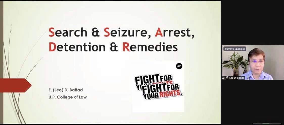 Afterwards, UP Law Professor Evelyn (Leo) Battad, human rights advocate and labor law expert, elaborated on the topic of search and seizure, arrest, detention, and remedies. She reviewed the Constitutional rights of a person during search and seizure, arrest, and detention. She then discussed the proper procedure during these instances and taught the participants what to look out for in cases where there are irregularities in its conduct. She also gave additional legal and practical tips on what to do during these occurrences, what precautions to take, and how to rationally protect one’s rights under these scenarios. Prof. Battad also discussed various remedies in case of violations of rights or deviations from the standard procedure, and the special writs available. After the presentation, an open forum was held to allow the participants to clarify any lingering questions. This was followed by a workshop activity facilitated by the UP IHR lawyers. The discussion groups then presented their outputs in a plenary, which Prof. Battad assessed.