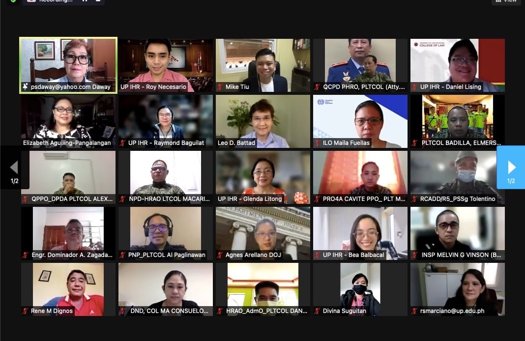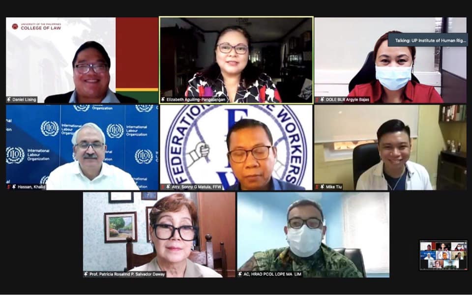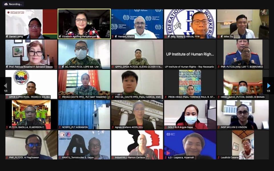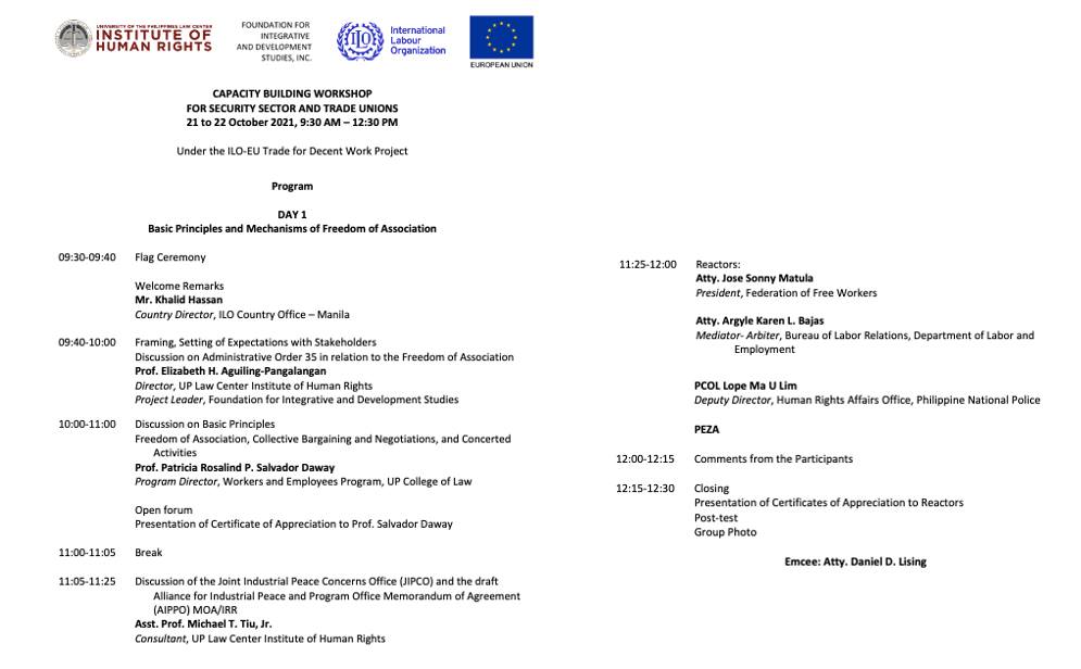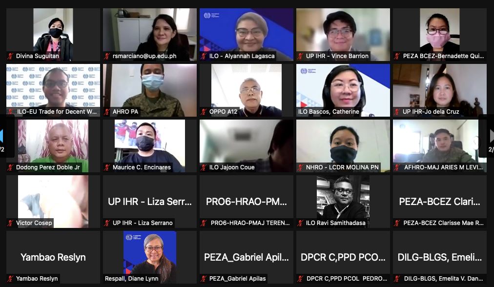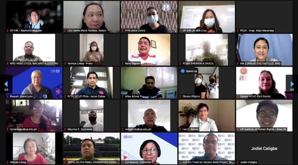 The UP Institute of Human Rights (UP IHR), together with the Foundation for Integrative and Development Studies, International Labour Organization (ILO), and European Union, conducted the “Capacity Building Workshop for Security Sector and Trade Unions.” This two-day workshop held on 21 and 22 October 2021 formed part of the ILO’s Safe and Decent Work in Ecozones Project.