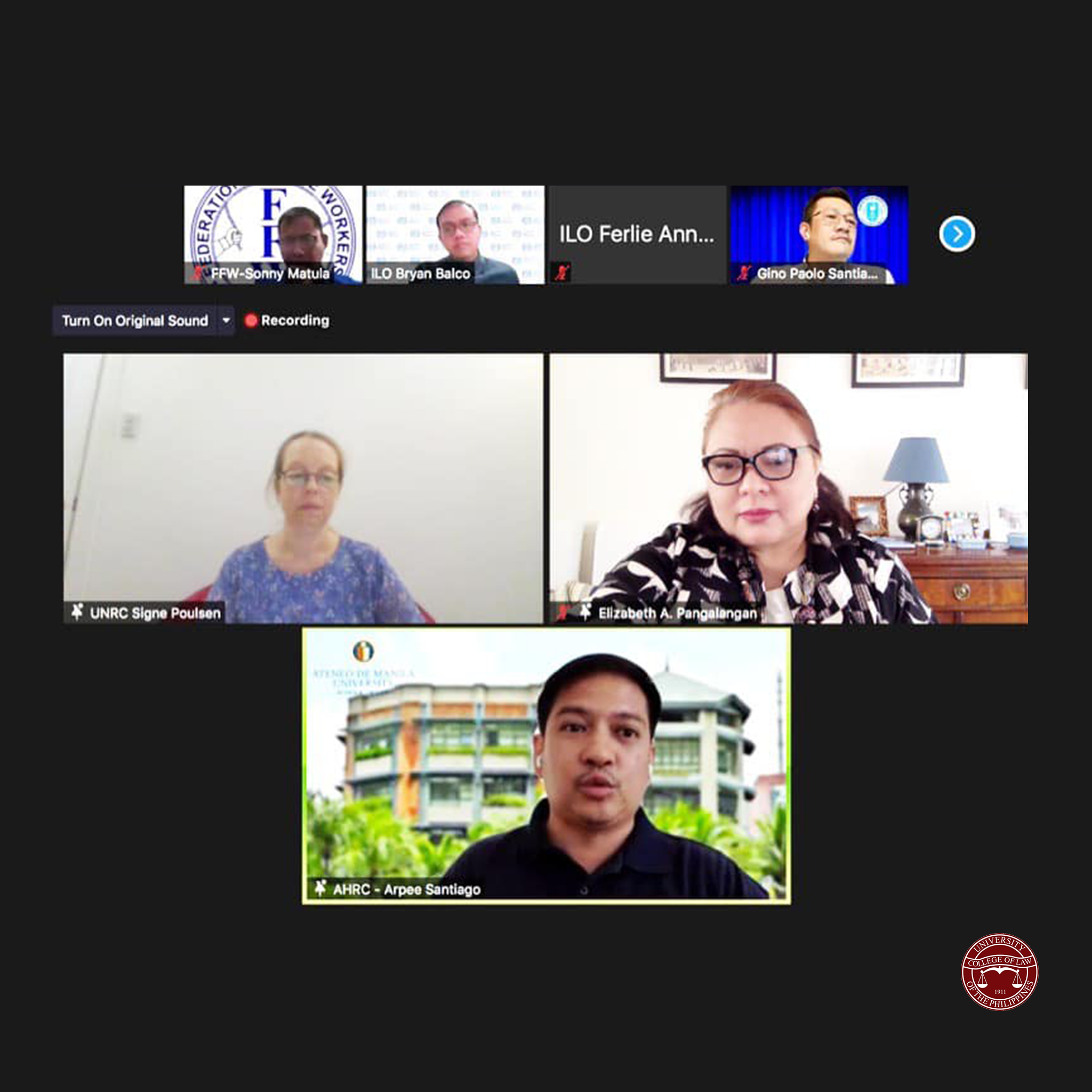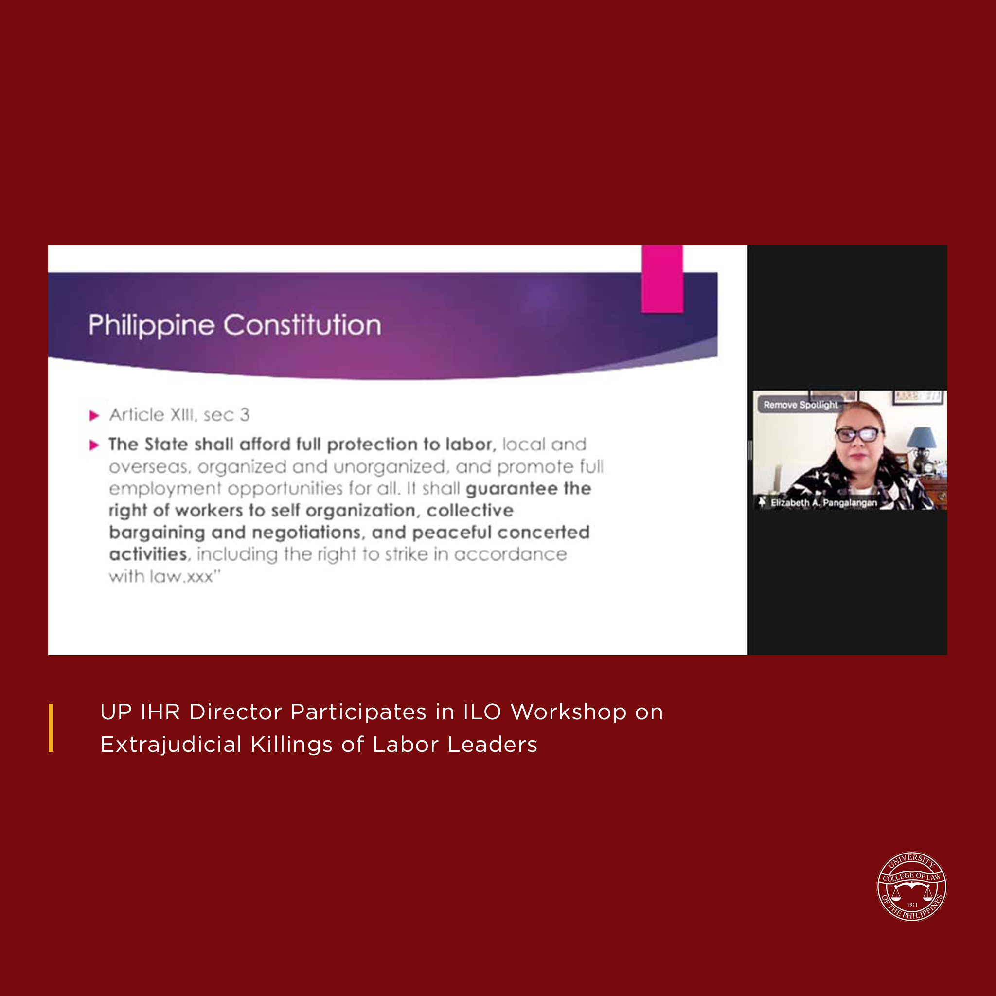 Among those who spoke was UP Institute of Human Rights (UP IHR) Director Prof. Elizabeth Aguiling-Pangalangan, who discussed the current challenges to trade union rights in relation to A.O. 15. She underscored that no less than the 1987 Constitution affords full protection to labor, recognizing their rights to self-organization, collective bargaining, and peaceful concerted activities. These rights are likewise found in international instruments, such as the UN Declaration of Human Rights, as well as the fundamental obligations of all ILO members.