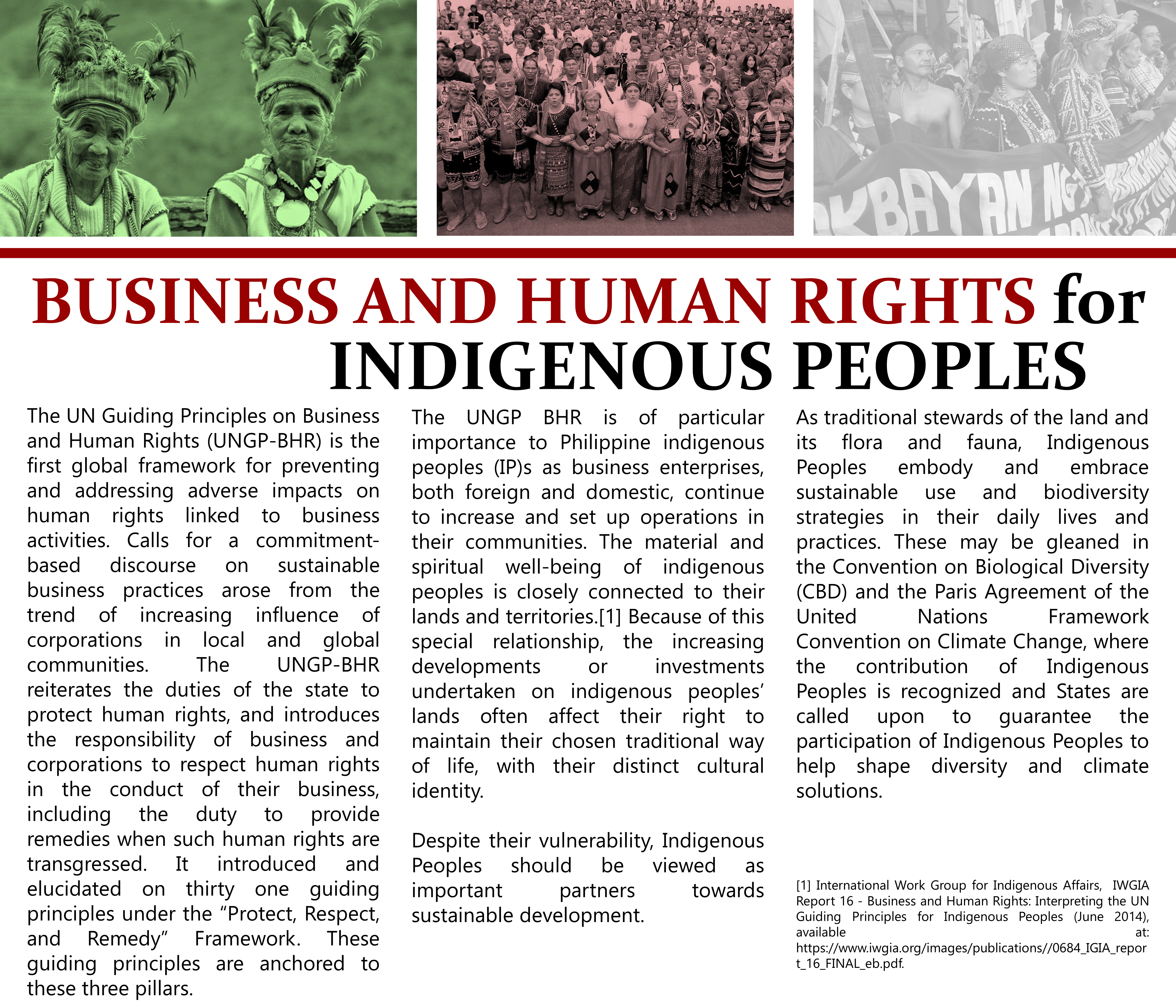 In observance of the National Indigenous Peoples’ Month, which is commemorated every October as declared by Presidential Proclamation No. 1906, the UP Institute of Human Rights (UP IHR) published an album entitled “Indigenous Peoples, Human Rights, and Businesses” to discuss the intersections of Indigenous Peoples (IP) rights and business and human rights (BHR) issues.