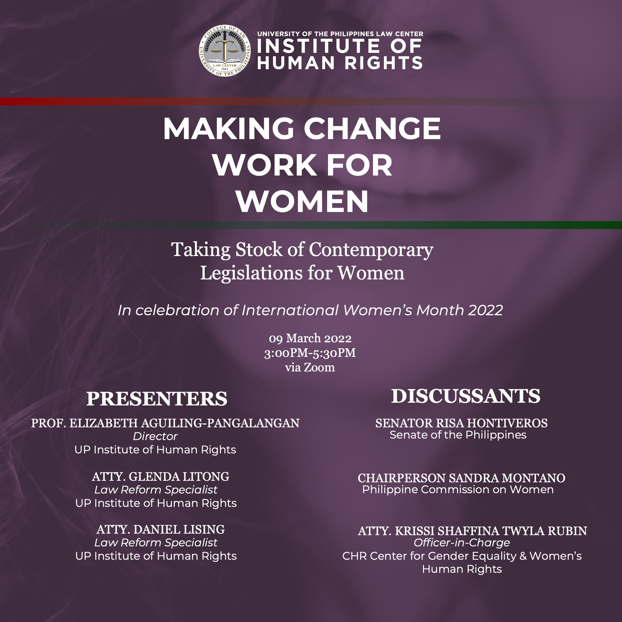 In celebration of international women’s month, the UP Institute of Human Rights (UP IHR) organized an online forum entitled “Making Change for Women: Taking Stock of Contemporary Legislations for Women” via Zoom and Facebook Live on 9 March 2022. The event featured key legislations on women’s rights.