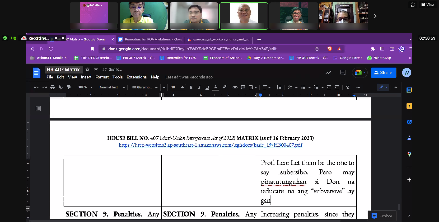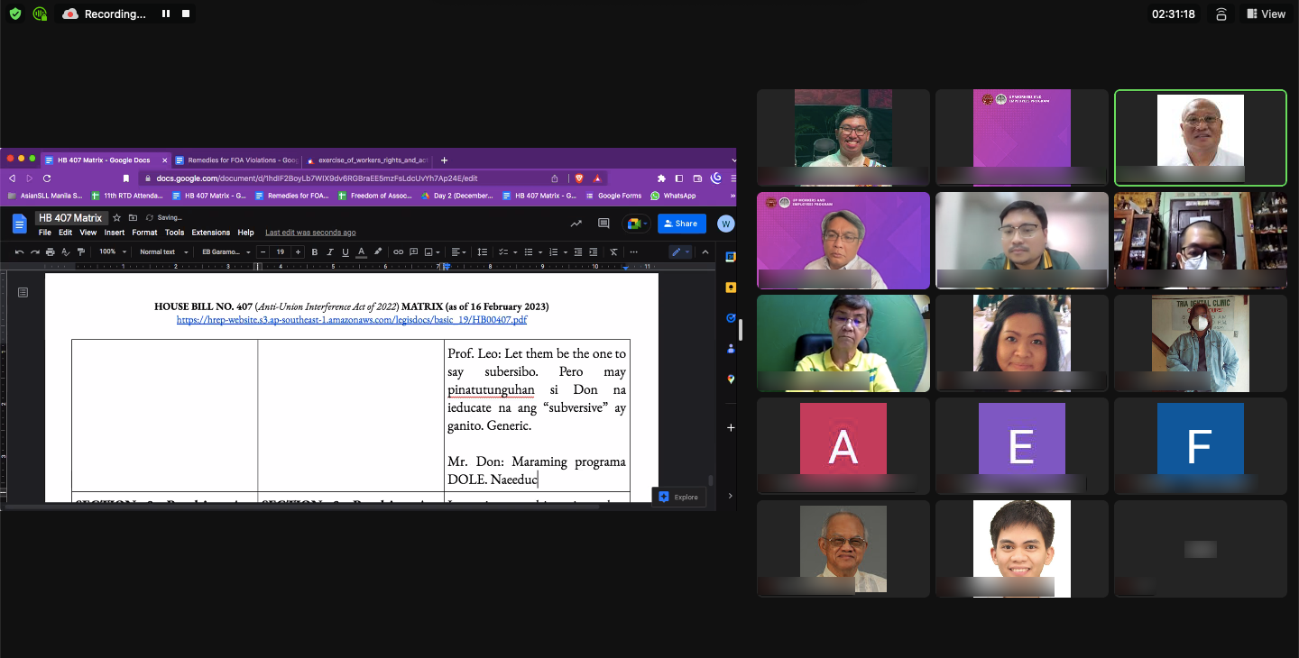 The Workers and Employees Program (WEP) of the University of the Philippines College of Law/Law Center conducted a virtual Round Table Discussion (RTD) on 4 March 2023. This marks the second (2nd) RTD on Freedom of Association (FOA), and the eleventh (11th) RTD of WEP since it was established in June 2021. While the last RTD served to establish the rationale and context on FOA in the Philippines today, the latest RTD provided a platform for concerned labor organizations to propose measures that would strengthen the protections to FOA contained in House Bill No. (H.B.) 407, otherwise known as the proposed Anti-Union Interference Act of 2022.