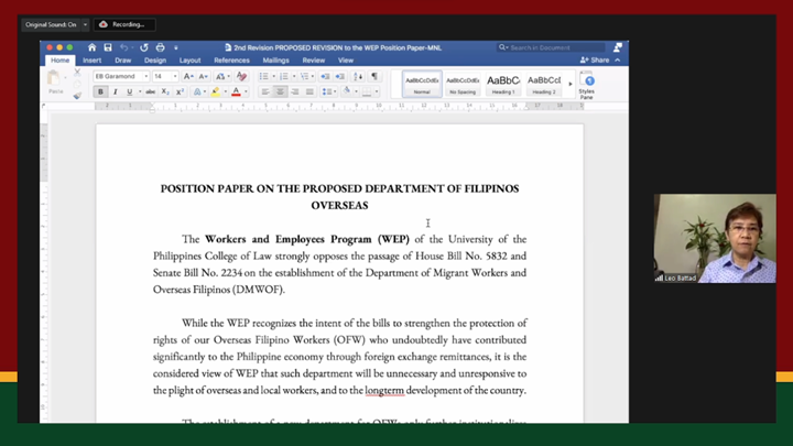 Prof. Evelyn (Leo) D. Battad presented the position paper of the WEP on the two bills creating the Department of Overseas FIlipinos, House Bill No. 5832 and Senate Bill No. 2234. She explained that WEP is strongly opposing the passage of the bill, citing several reasons: (1) the creation of such a department will be unnecessary and unresponsive to the plight of overseas and local workers and the long-term development of the country; (2) the establishment of the department only continues to institutionalize a stopgap measure to address the increasing unemployment and underemployment from the 70s and 80s; (3) it perpetuates and rationalizes the overdependence of the Philippine government on OFWs as drivers of economic growth; (4) the bill reinforces the thrust of past and present administrations to export labor as a major means to spur economic growth and development; and (5) the budget and resources for the creation of said department could be better devoted to providing work opportunities and ensuring security of tenure and providing other support services to workers, farmers, informal workers, and small entrepreneurs.