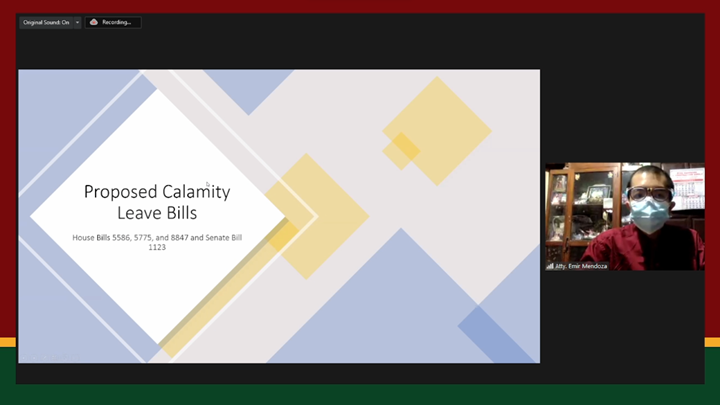 The bills identified by WEP as representing the most pressing labor issues for the 18th Congress were presented by Atty. Emir V. Mendoza. These bills are House Bill Nos. 5586, 5775, and 8847 and Senate Bill 1123 which all provide a calamity leave in both the public and private sectors and House Bill No. 7036 and Senate Bill No. 806 which deal with security of tenure and endo.