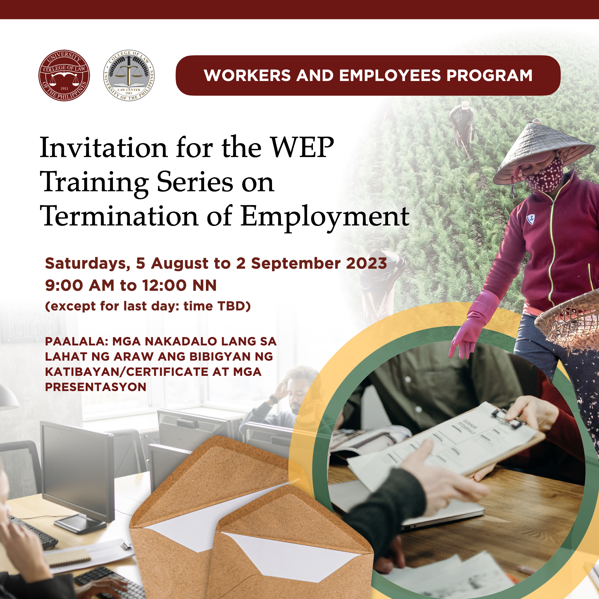 The Workers and Employees Program (WEP) of the University of the Philippines College of Law/Law Center (UP Law) conducted its Training Series on Termination of Employment in the Private Sector in August and September 2023. This was the third WEP training series, after the first on Workers’ and Employees’ Rights and Benefits Under Labor Standards Laws from September to October 2022, and the second on Labor Relations from May to July 2023.